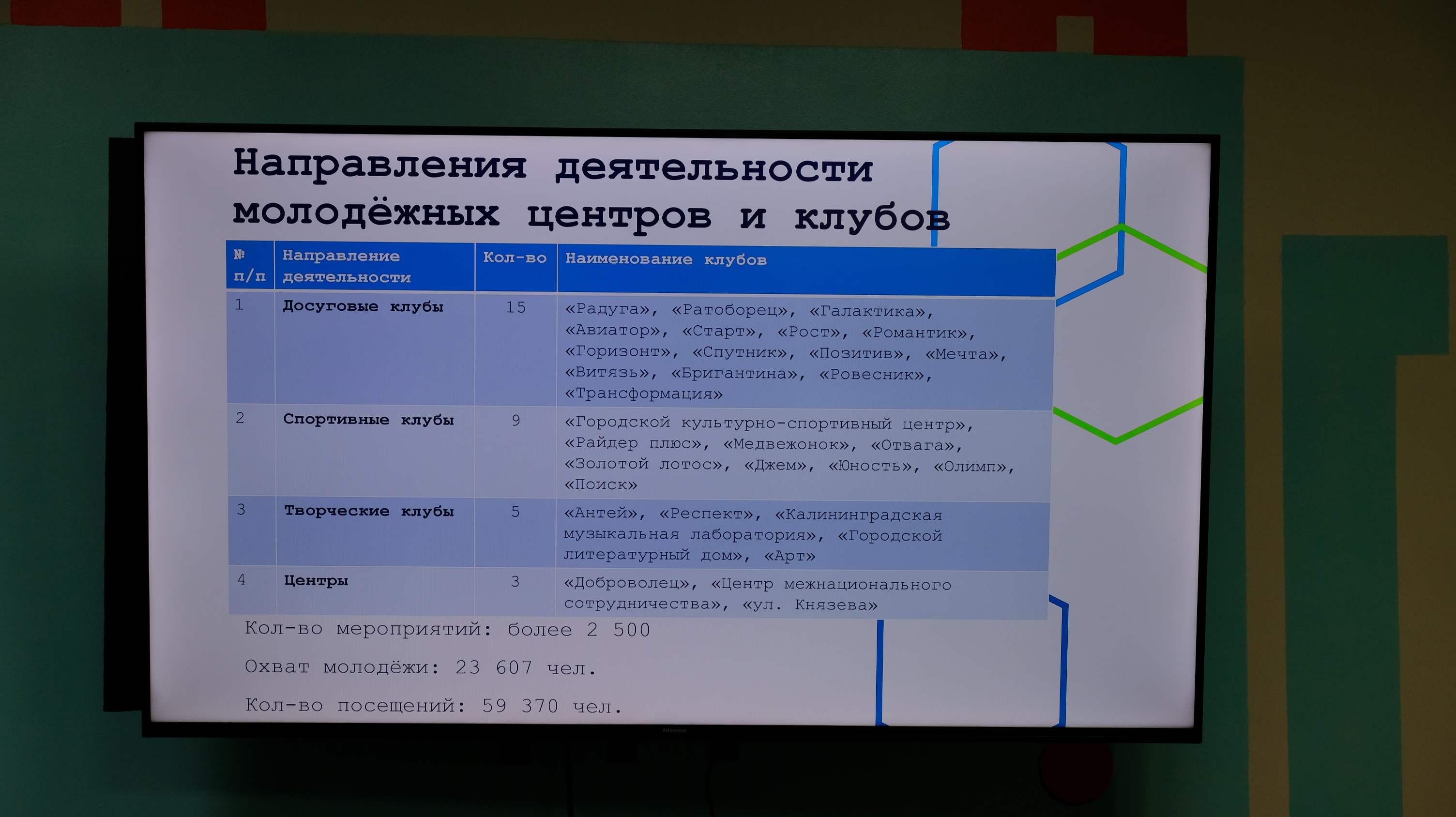 Ежегодно в Калининграде открываются новые современные молодежные пространства, обеспечивающие позитивный досуг и занятость, формирующие среди молодёжи любовь к здоровому образу жизни, создающие условия для самореализации молодежи, развития творческого, профессионального, интеллектуального потенциалов.