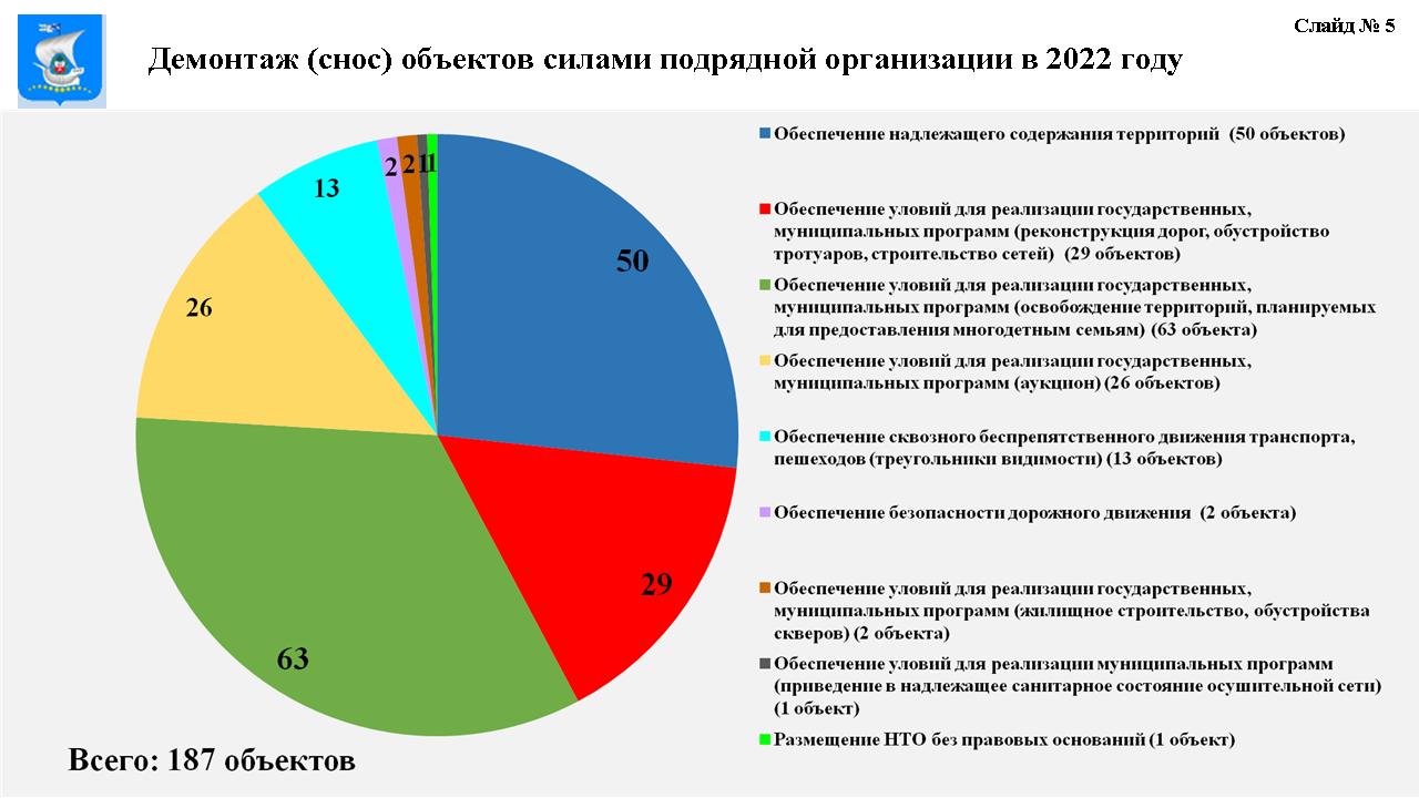 Снос самостроев помогает обеспечению надлежащего содержания территорий — 50 объектов; обеспечению условий для реализации государственных, муниципальных программ (реконструкция дорог, обустройство тротуаров, строительство сетей) — 29 объектов; обеспечению условий для реализации государственных, муниципальных программ (аукцион) — 26 объектов; обеспечению сквозного беспрепятственного движения транспорта, пешеходов (треугольники видимости) — 13 объектов; обеспечению безопасности дорожного движения — 2 объекта; обеспечению условий для реализации государственных, муниципальных программ (жилищное строительство, обустройство скверов) — 2 объекта; обеспечению условий для реализации государственных, муниципальных программ (освобождение территорий, планируемых для предоставления многодетным семьям) — 63 объекта.