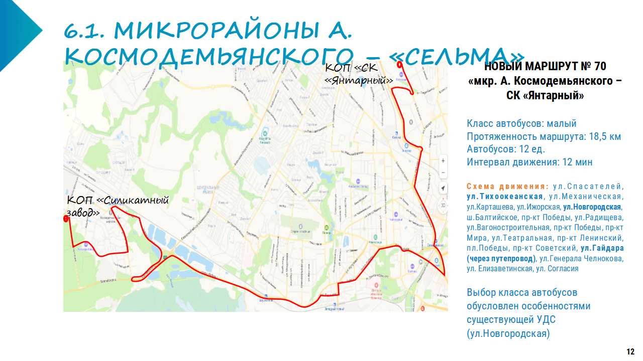 По многочисленным обращениям жителей микрорайонов А. Космодемьянского и Сельма об отсутствии сообщения организуем новый маршрут. Он будет проходить от Силикатного завода по отремонтированной ул. Тихоокеанской мимо ФОКа «Автотор-Арена» через весь микрорайон и по ул. Новгородской выходить на Балтийское шоссе в сторону центра города.