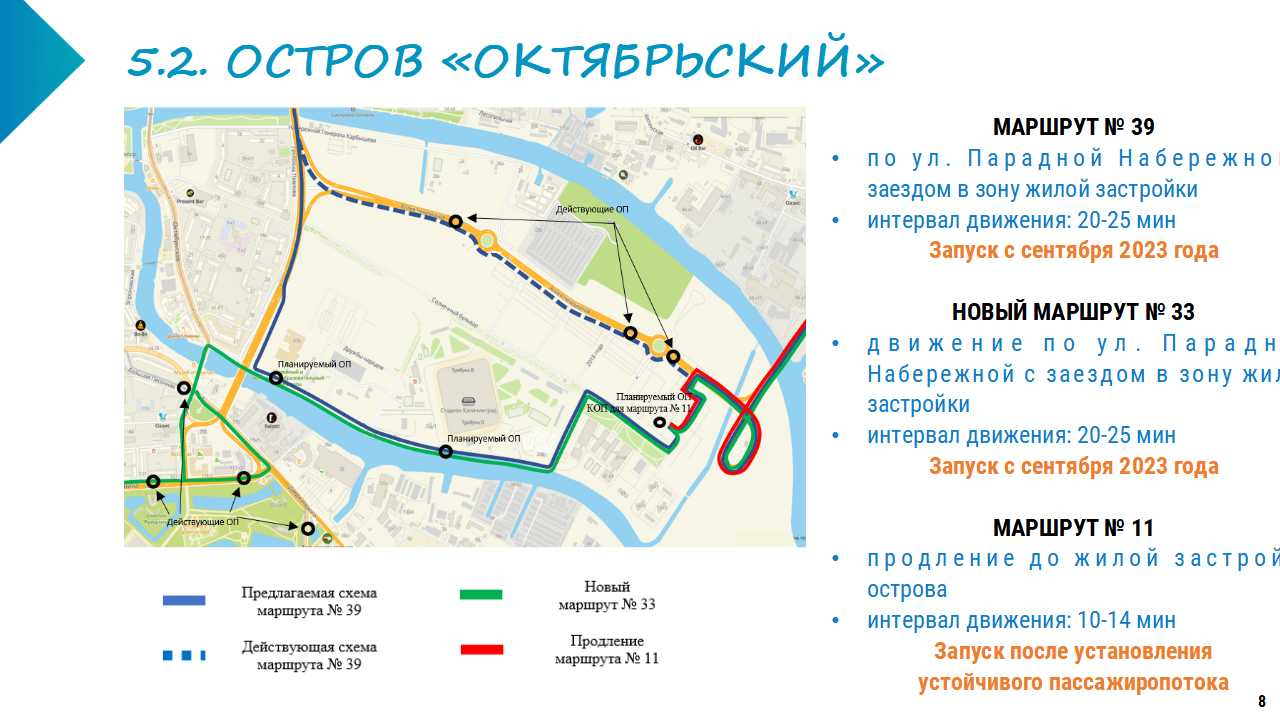 Сейчас по острову в районе стадиона «Калининград» проходит маршрут № 39, он идет по ул. 9 Апреля и спускается со второй эстакады на Аллею Чемпионов. Все точки притяжения, такие как филиал ЦМШ-АИИ «Балтийский», филиал Третьяковской галереи и филиал Большого театра, находятся вблизи Парадной Набережной. Поэтому принято решение об изменении 39 маршрута с организацией его движения по Парадной Набережной. Для реализации таких изменений, в рамках организации парковочного пространства около филиала ЦМШ-АИИ «Балтийский», сейчас нужно увеличить радиусы поворотов для беспрепятственного проезда больших автобусов. Таким образом автобусы смогут доезжать до зоны жилой застройки. Для увеличения частоты движения автобусов по такой же схеме будет проходить новый маршрут № 33. Интервал движения общественного транспорта, то есть двух маршрутов в этой части острова, составит 10-12 минут. Будем следить за пассажиропотоком на Острове и, в случае необходимости, запустим туда еще 11 маршрут, который сейчас “кольцуется” на круговом движении на ул. Марш. Покрышкина.