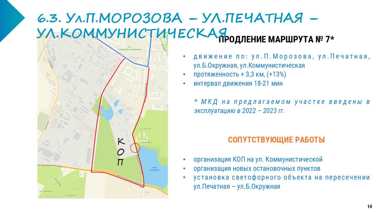 На протяжении последних двух лет активно застраиваются и уже вводятся в эксплуатацию МКД в районе улиц П. Морозова, Печатной, Коммунистической. Поступают обращения жителей, поэтому изменим маршрут № 7. Теперь с ул. П. Морозова автобусы будут поворачивать на ул. Печатную, выезжать на Окружную и левым поворотом уходить на ул. Коммунистическую, где будет организован конечный остановочный пункт для отдыха линейного состава. Для безопасного выезда больших автобусов на Окружную с ул. Печатной будет предусмотрен светофор. Интервал движения автобусов составит 18-21 мин.