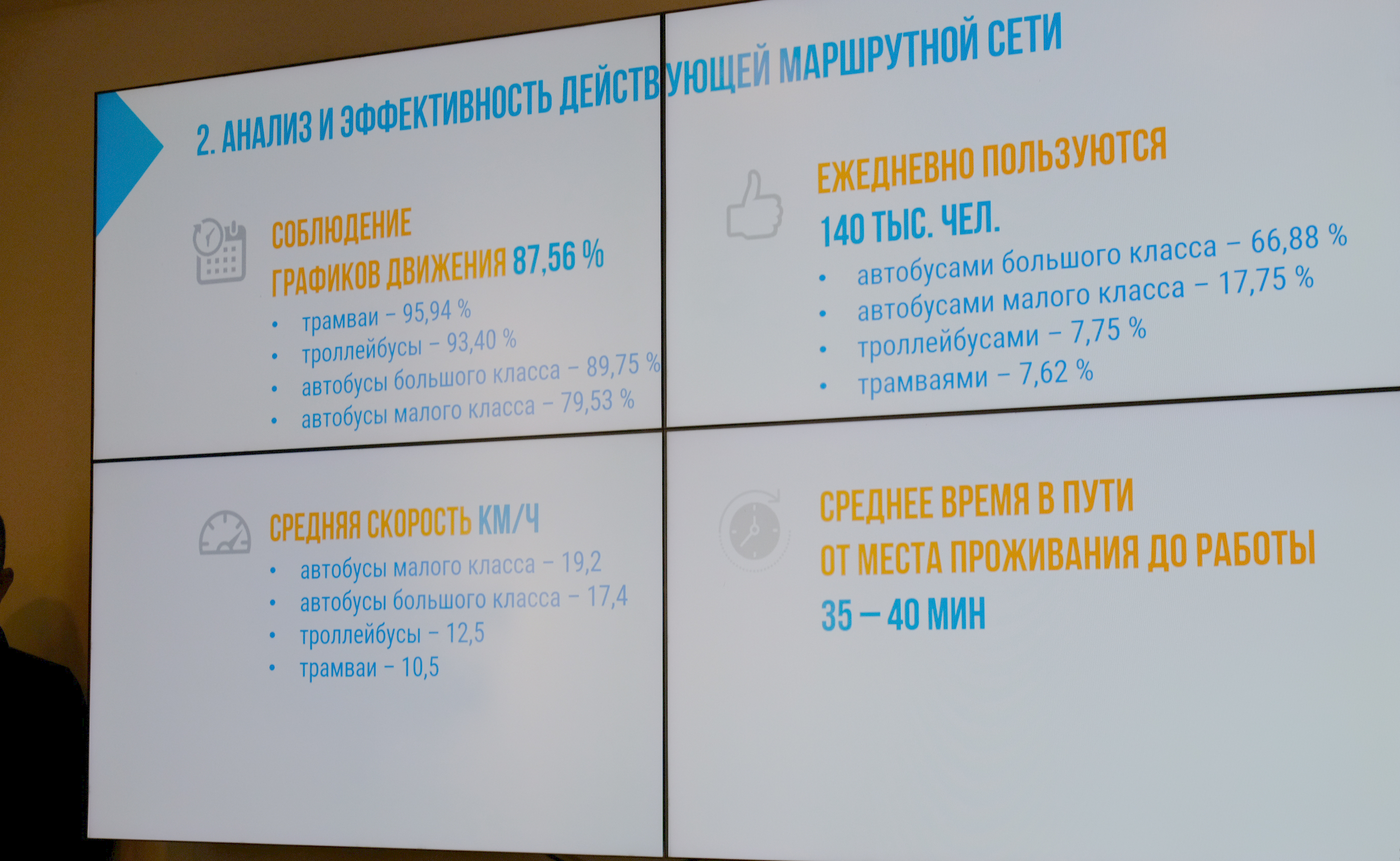 В следующих контрактах, которые также будут заключаться на 3 года (среднесрочный период, позволяющий планировать экономику), поднимаем планку. Автобусы, обновляемые перевозчиками, должны быть не старше 10 лет, естественно, иметь 100% низкий пол и кондиционеры, в течение срока исполнения контрактов перевозчики должны будут дооснастить автобусы аудиозаписью, боковыми электронными трафаретами, датчиками пассажиропотока, стационарными терминалами оплаты и отдельными навигационными блоками для передачи данных в ЭРУ-ГЛОНАСС, а также отказаться от размещения наружной рекламы на автобусах. Планируется обновить 59 единиц.