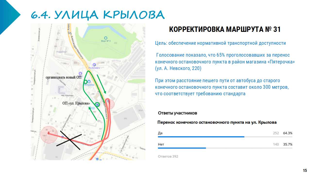 Сейчас конечный остановочный пункт автобусов маршрута № 31 располагается на ул. Большой Окружной 4-ой. Такое размещение разворотного кольца (в связи с особенностями УДС – одностороннее движение) не позволяет жителям микрорайона, расположенного в конце ул. А. Невского, доезжать до их ближайшего остановочного пункта «ул. Крылова», следуя из центра города. Им приходится идти более 1 км. Проведя опрос среди жителей района, пришли к решению о переносе конечного остановочного пункта в район ул. Крылова. При этом расстояние пешего пути от автобуса до старого конечного остановочного пункта составит около 300 метров, что соответствует требованию социального стандарта* транспортного обслуживания населения, утвержденного Минтрансом РФ (500 м).