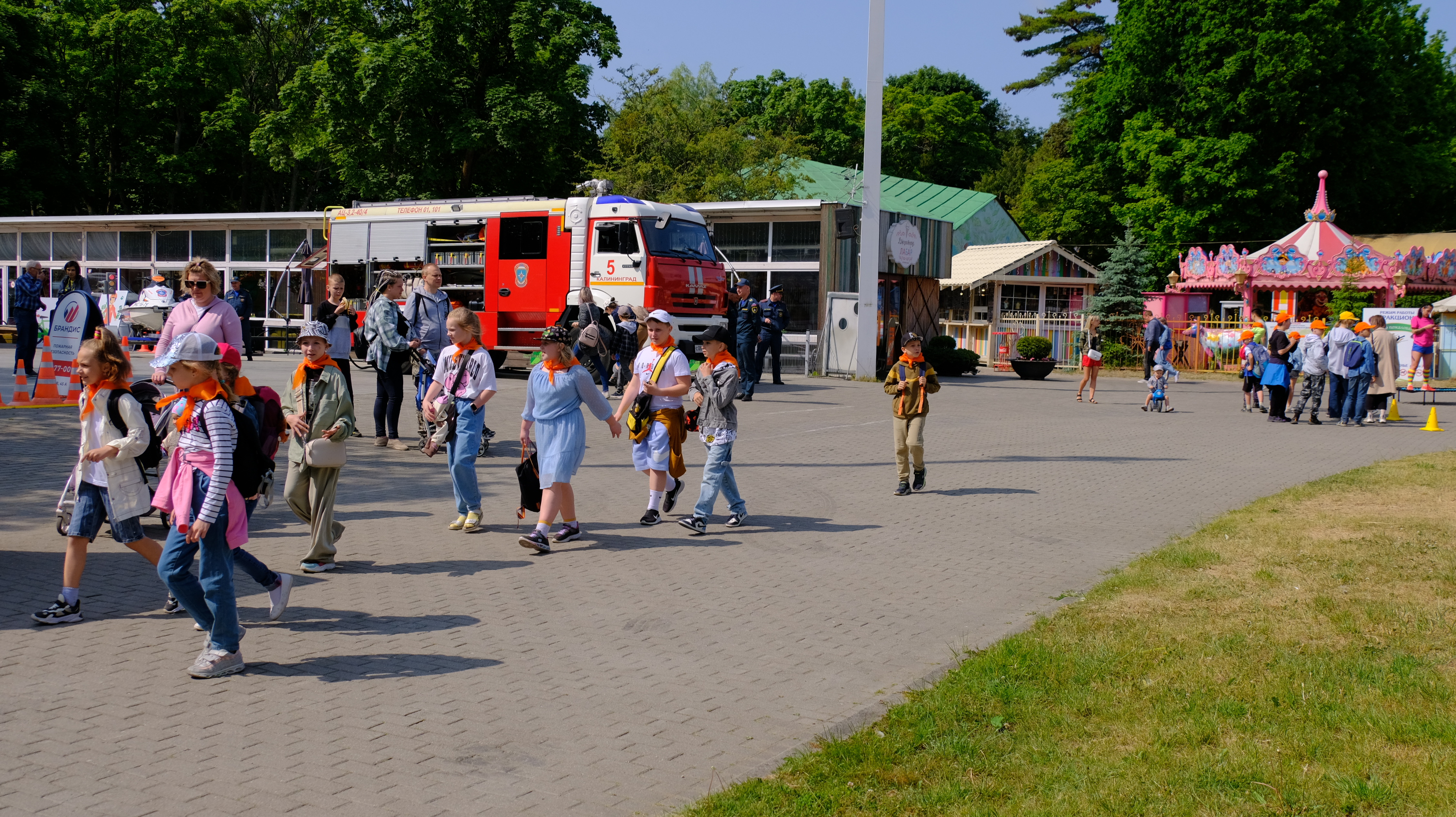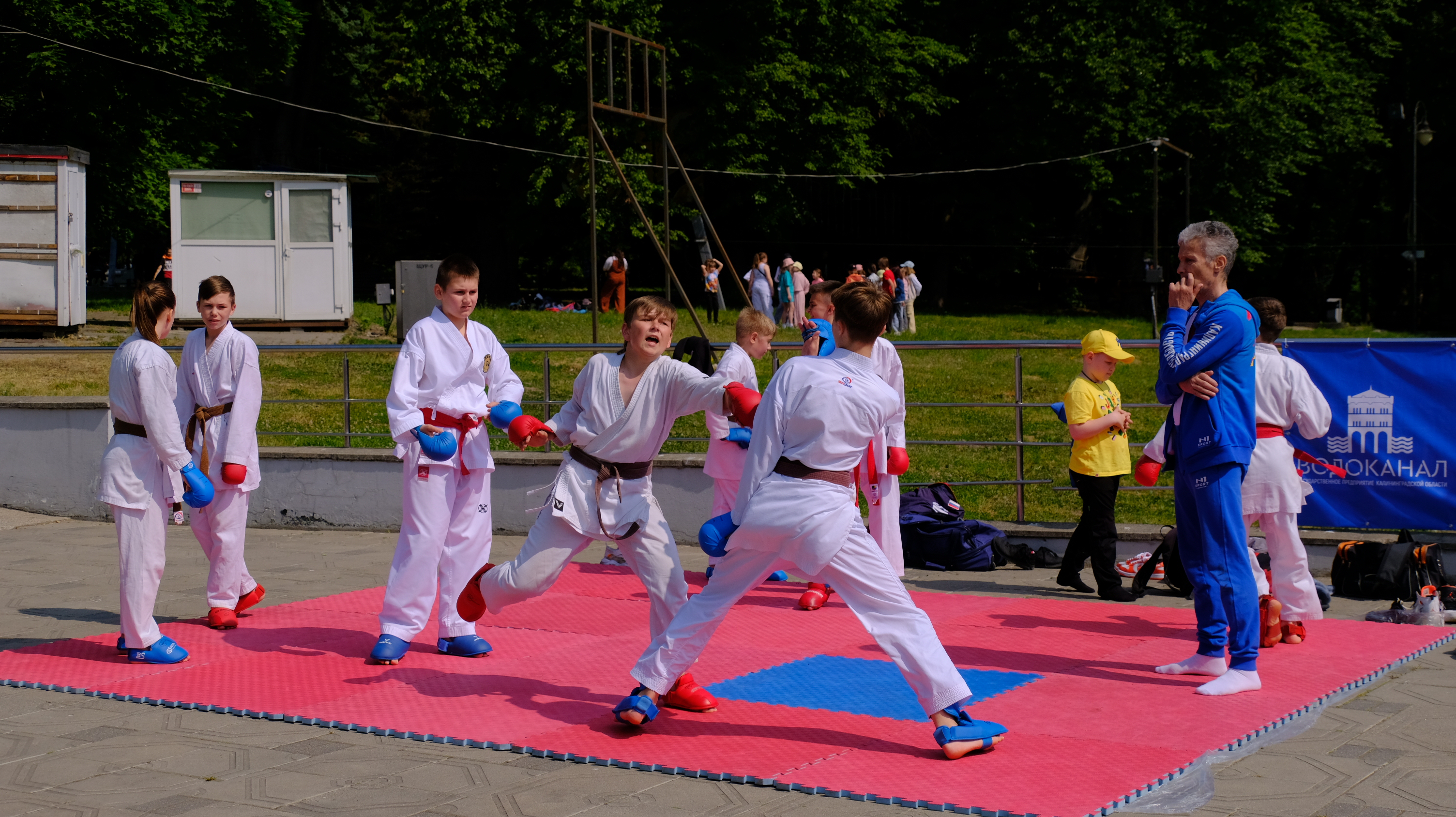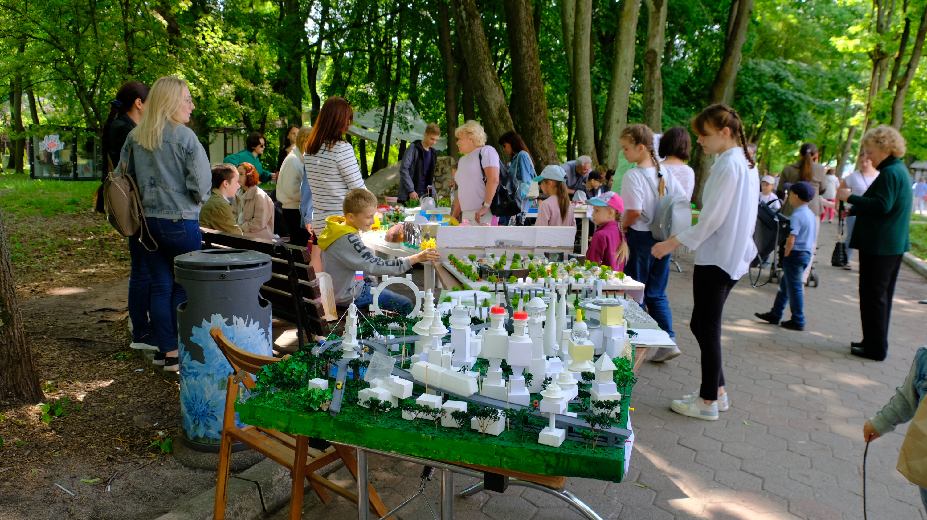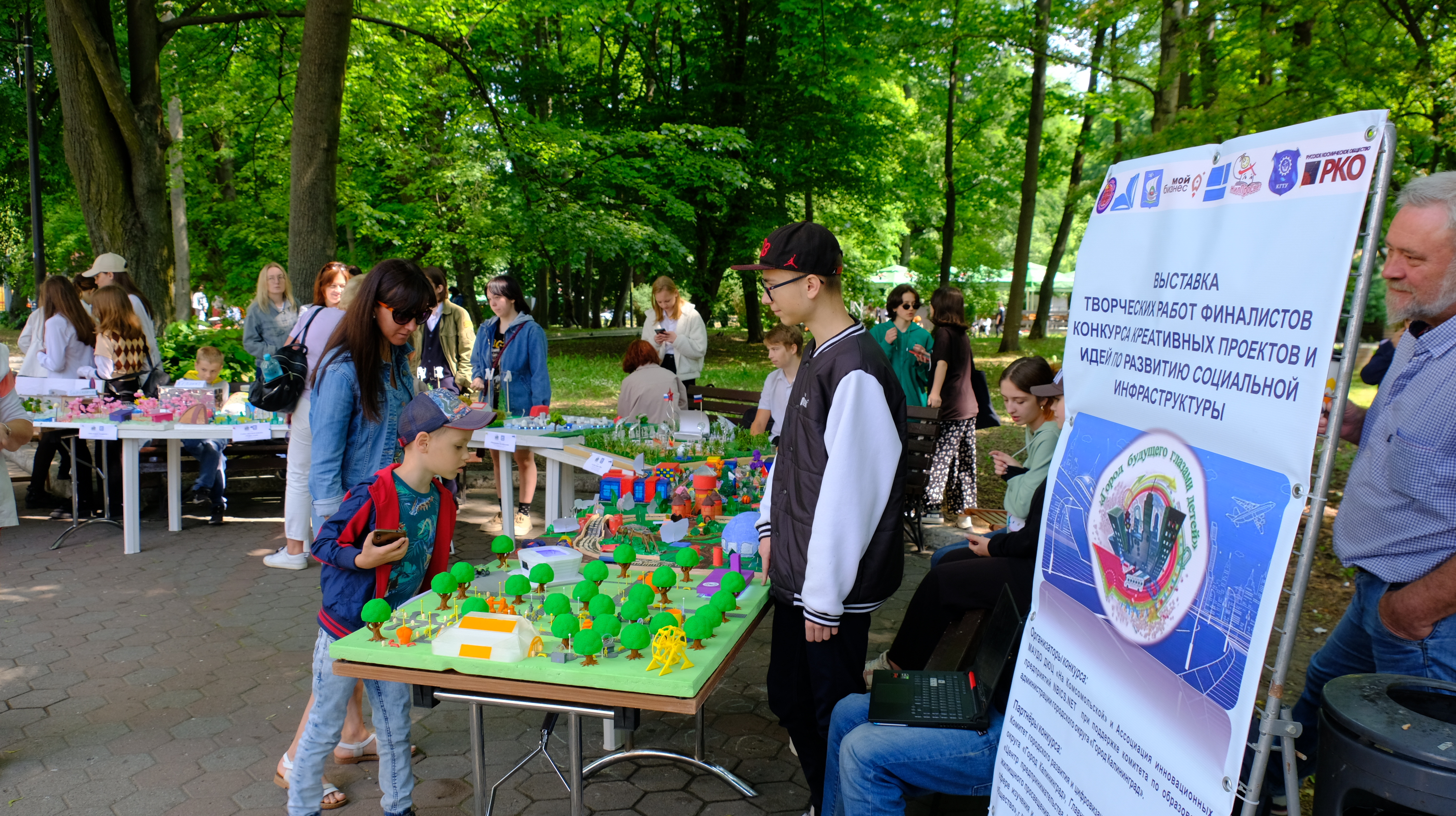 Весь день на территории парка проходят мероприятия: выставка работ III открытого городского конкурса креативных проектов и идей по развитию инфраструктуры города «Город Калининград – город будущего глазами детей», мастер-классы по прикладному искусству, работает зона технического творчества робототехники, можно поучаствовать в прохождении трассы радио-управляемыми машинками, проводятся соревнования по шахматам, на спортивной площадке показательные выступления по волейболу, баскетболу, каратэ, спортивной гимнастике, имитация гребли на байдарках и каноэ с веслом, мастер-класс по теннису, по силовым видам спорта, а также прием испытаний комплекса ГТО.