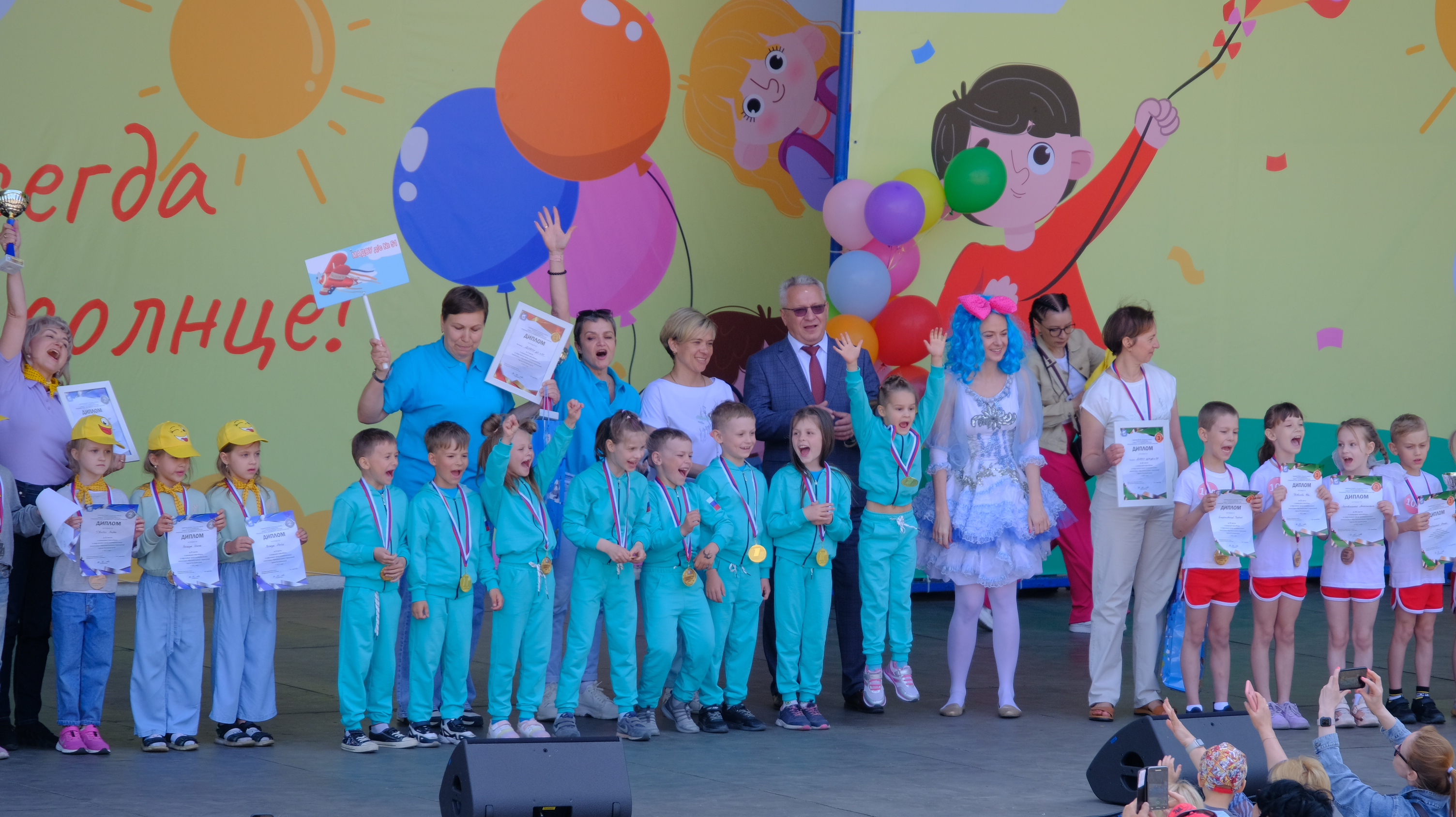 На сцене провели церемонию награждения победителей и призеров городской спартакиады дошкольных образовательных учреждений. Победителями по количеству очков в общем зачёте стала команда 51-го детского сада, второе место у детского сада № 127, третье место заняли воспитанники детского сада № 105.