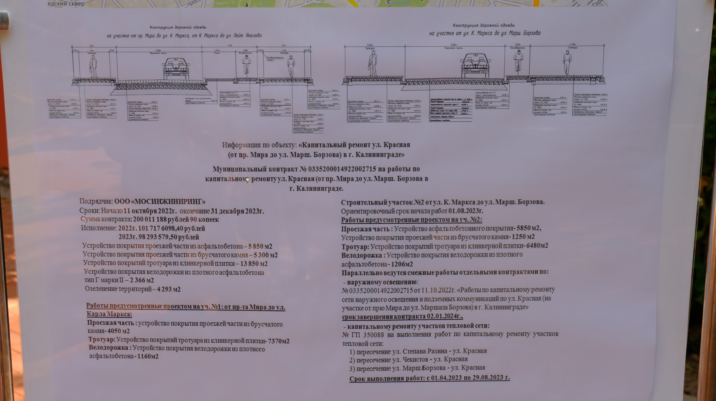 Право на выполнение работ через победу в открытом аукционе получило калининградское ООО «МОСИНЖИНИРИНГ», по контракту компании нужно будет заплатить 200 млн рублей. Подрядчик хорошо зарекомендовавший себя в нашем регионе. В Калининграде сейчас он доделывает улицу Театральную. Много объектов компания отремонтировала в области.