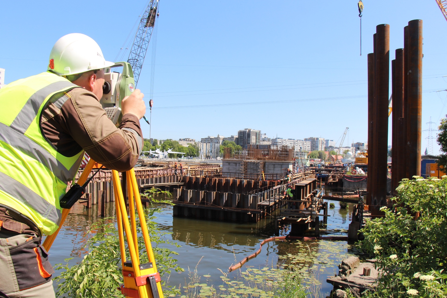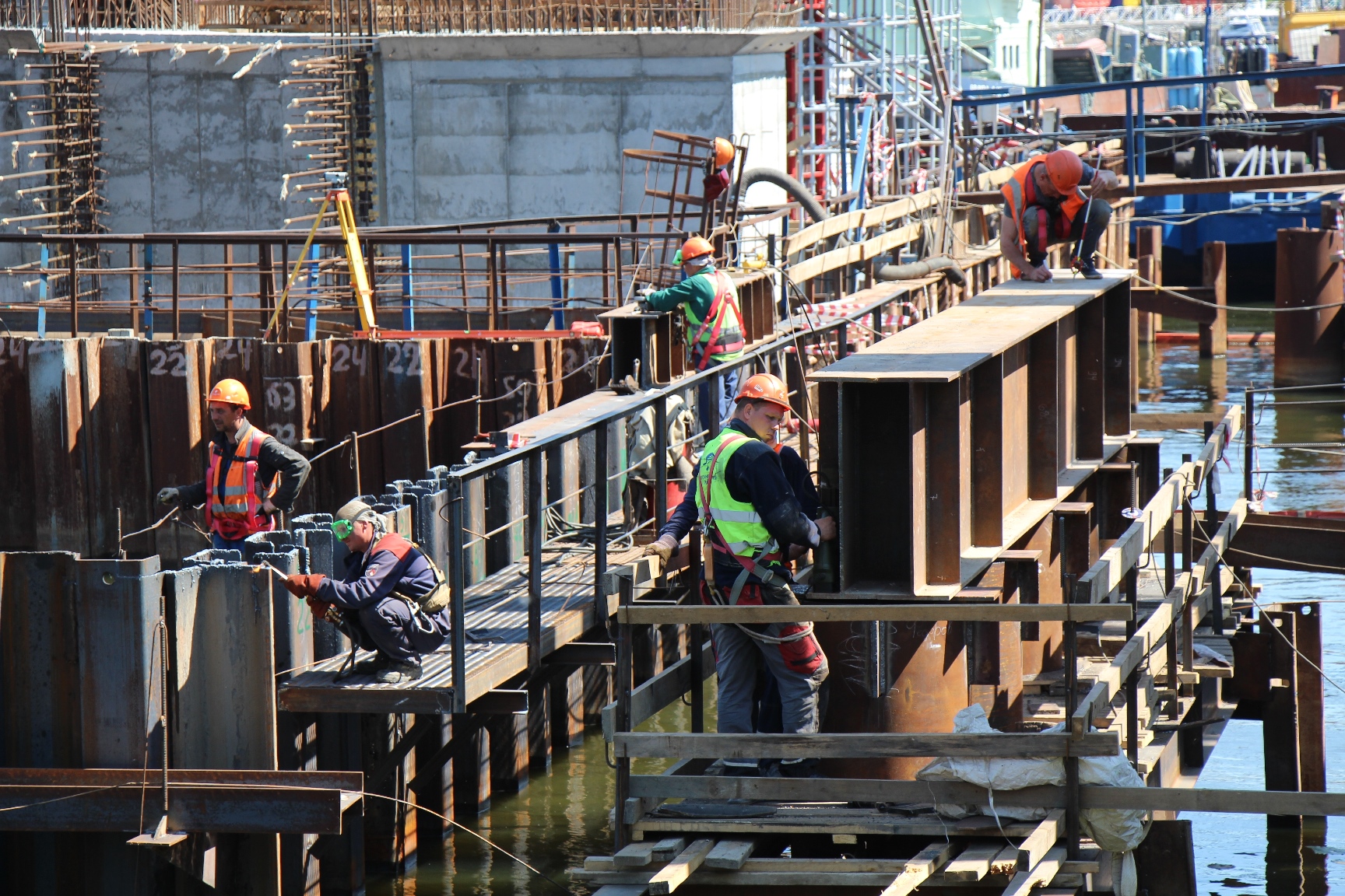 На автодорожном мосту через Преголю в районе двухъярусного завершили сборку подвижной платформы, идёт подготовка камер для бурения под опоры.