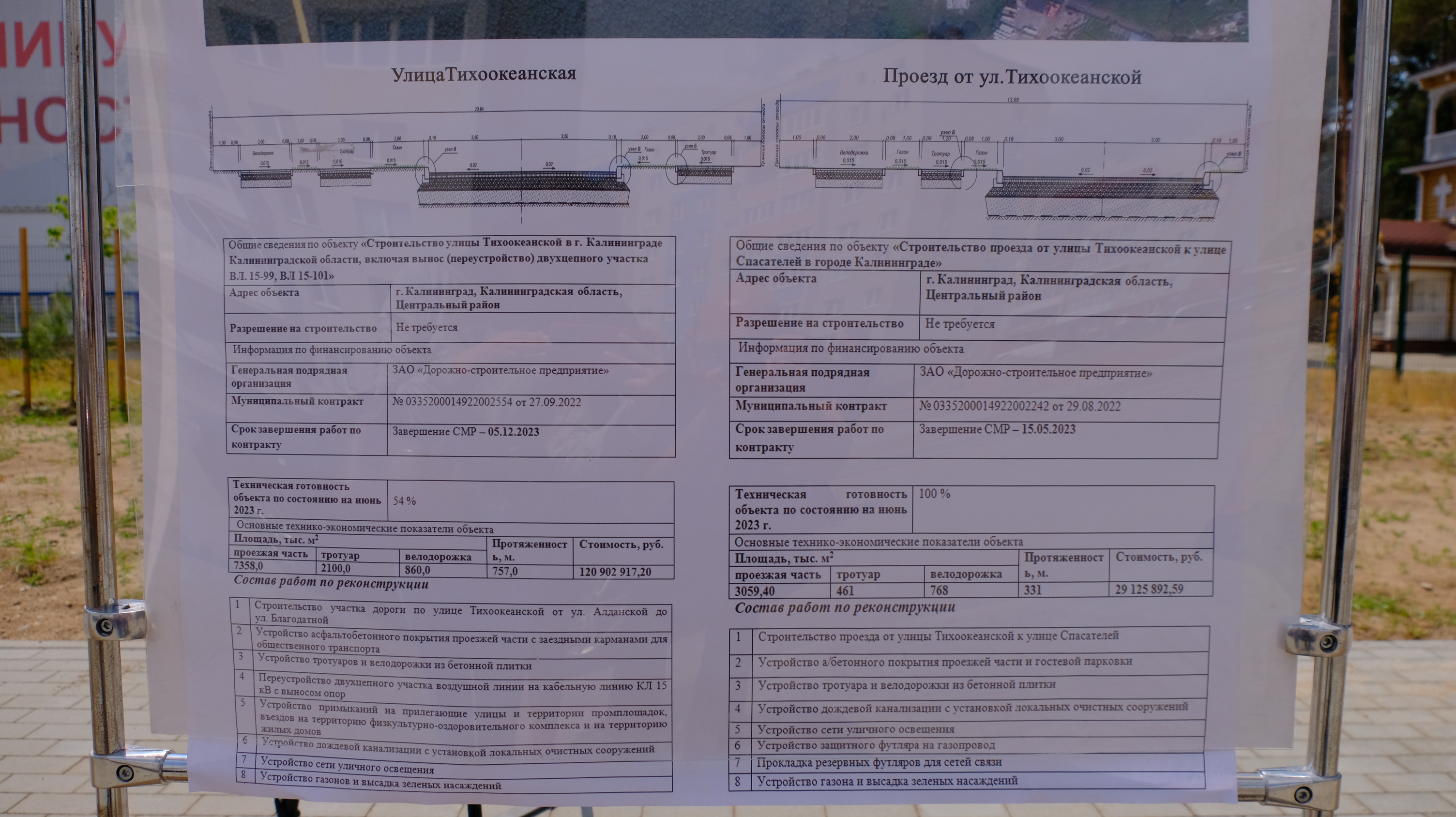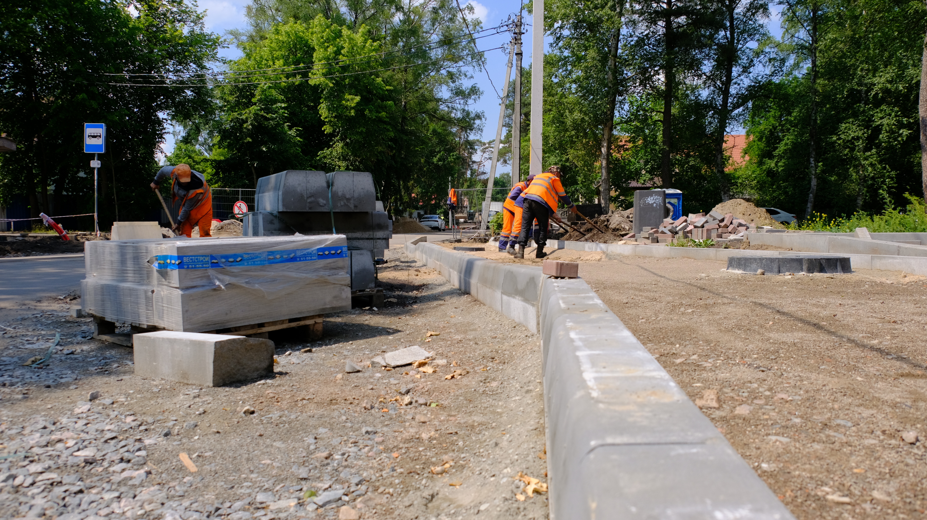 Закончен проезд с ул. Спасателей на ул. Тихоокеанской, вскоре должны убрать блоки и открыть движение. По самой Тихоокеанской выполнены работы по устройству сети дождевой канализации, уложен нижний слой асфальта, выложен плиткой тротуар, ведутся работы по прокладке высоковольтного кабеля. После поставки в регион опор и оборудования будет вынесена из створа улицы воздушная линия электропередачи и закончено асфальтирование.