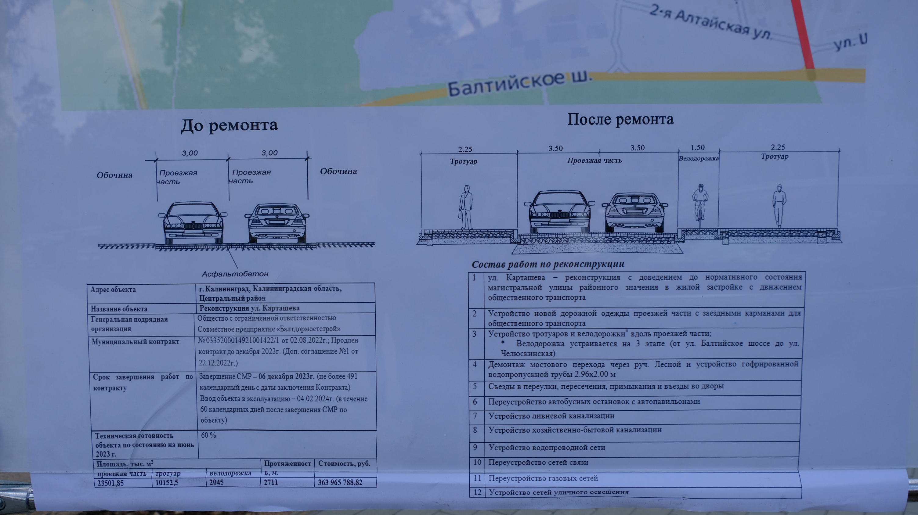 В ходе выездного совещания и.о. главы администрации Калининграда Игорь Шлыков рассказал журналистам, что к сентябрю планируется открыть техническое движение по всей проезжей части улицы Карташева, а также устроить тротуары.