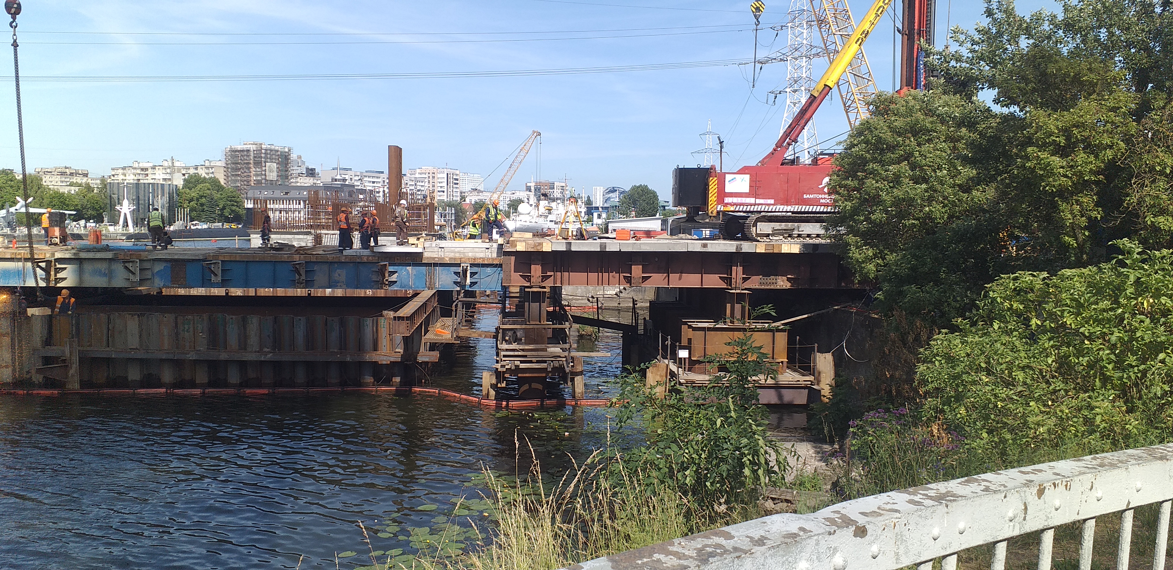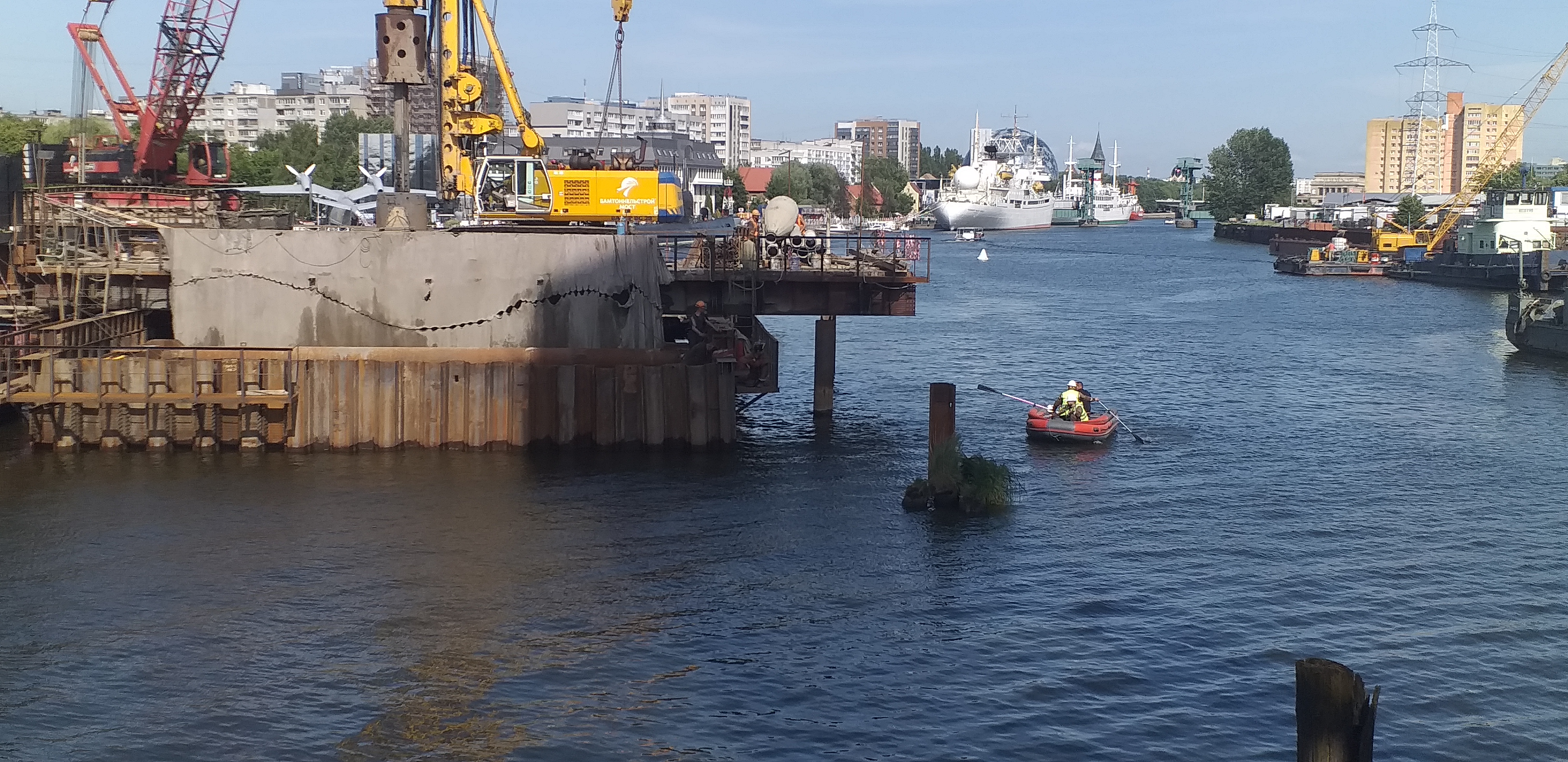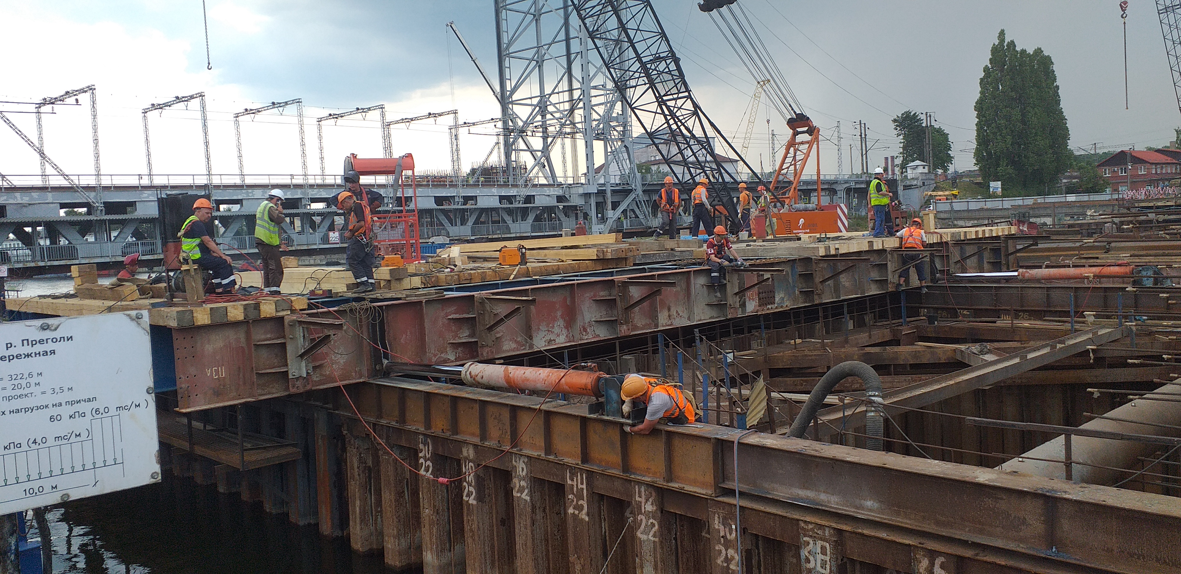 На автомобильном мосту через Преголю на уходящей неделе производились следующие строительно-монтажные работы: Опора № 4. Бурение и бетонирование. Опора № 5. Раскрепление котлована. Этап 2; Монтаж низового рабочего мостика. Устройство накаточных путей и платформы под буровой агрегат. Сборка бурового агрегата и подготовка к работе.