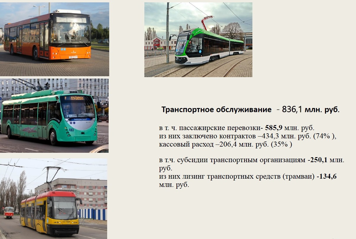 - организация транспортного обслуживания населения в границах Калининграда. На реализацию данного мероприятия предусмотрено 836,1 млн рублей: финансируются муниципальные контракты на работы, связанные с осуществлением регулярных перевозок пассажиров и багажа автомобильным и электрическим транспортом, обеспечивается функционирование автоматической системы проезда, предоставляется субсидия на возмещение недополученных доходов в связи с перевозкой льготных категорий граждан, субсидия на оплату части лизинговых платежей по договорам финансовой аренды (лизинга) трамваев.