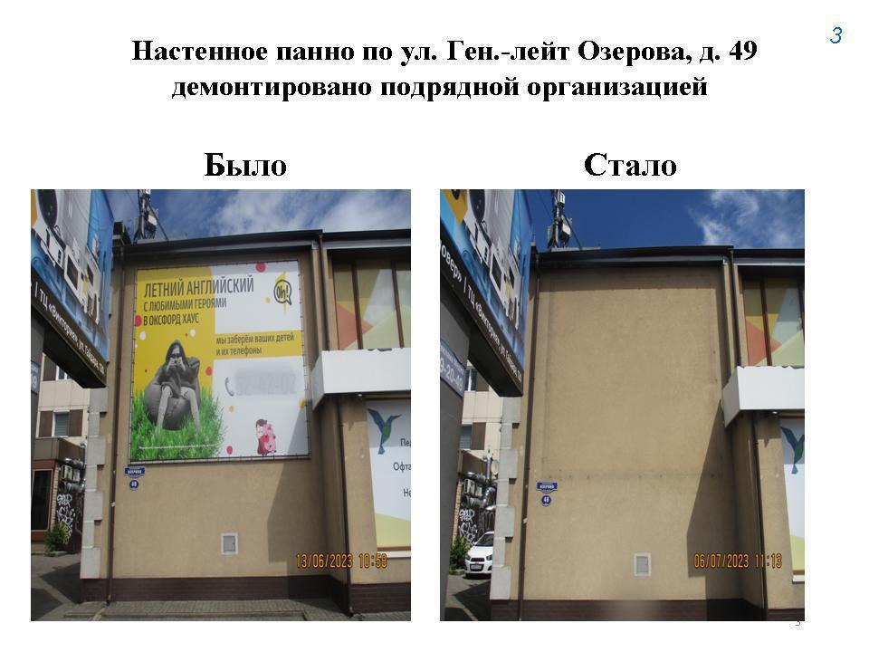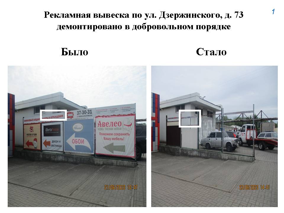 Владельцы самостоятельно сняли баннерные панно на ул. Дзержинского, 73. Демонтированы объемные буквы на фасаде дома по ул.Узловая. Подрядчик убрал настенное панно на Ленинском проспекте 11, рекламные вывески на ул. Театральной, стелу на Московском проспекте, настенное панно на ул. Ген. лейт. Озерова, 49.