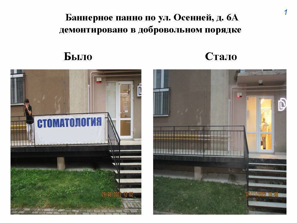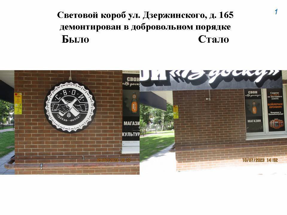 В лидерах по демонтажу незаконной рекламы – ул.Дзержинского. Владельцы добровольно сняли два банерных панно на д.165, световой короб на том же доме и объемные буквы на фасаде дома 168А. Рекламные вывески убрали с дома 4 по ул.Земнухова, д.18 по ул. Косм. Леонова и банерное панно с д.6А по ул. Осенняя.