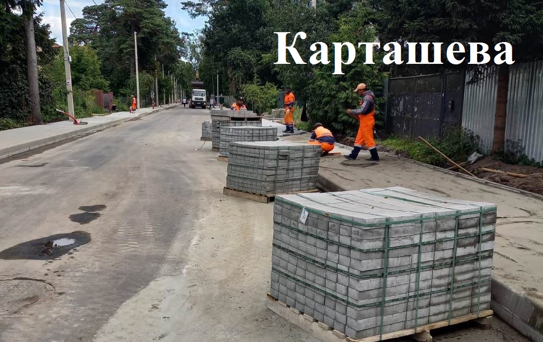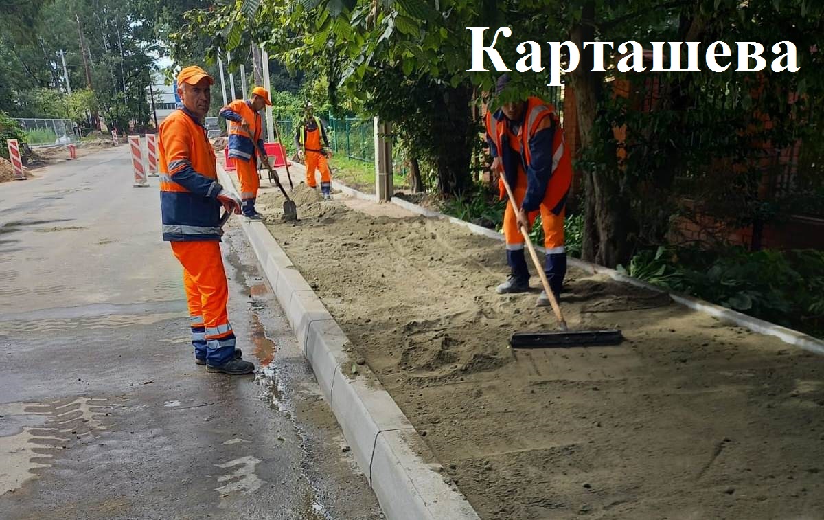 На ул. Карташева ставят бортовые камни и устраивают основания под тротуары, ведут трассу бытовой канализации к придомовым участкам ближе к ул. Магнитогорской.