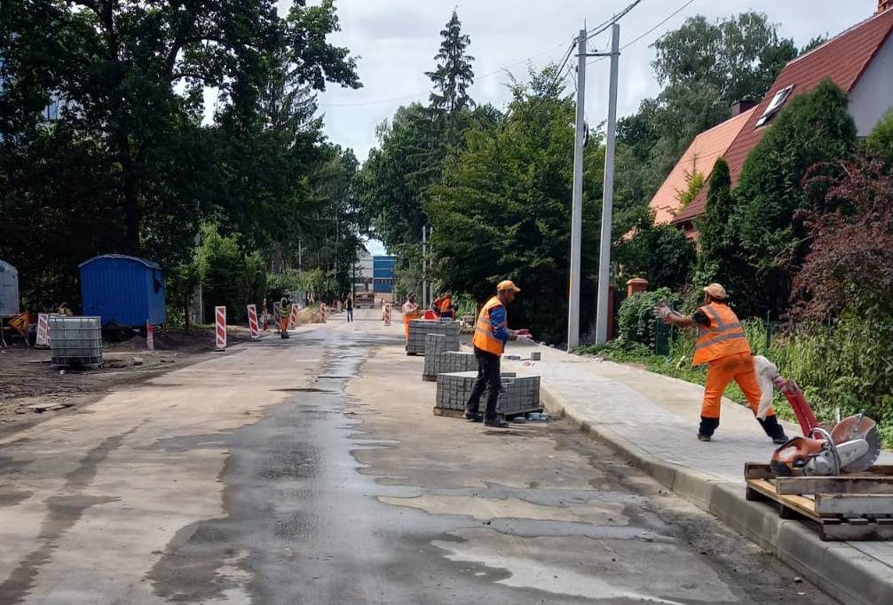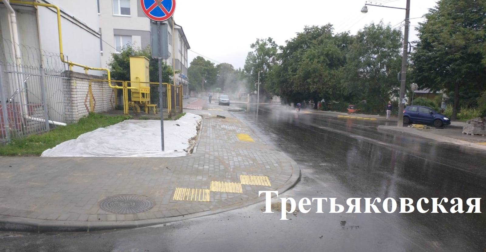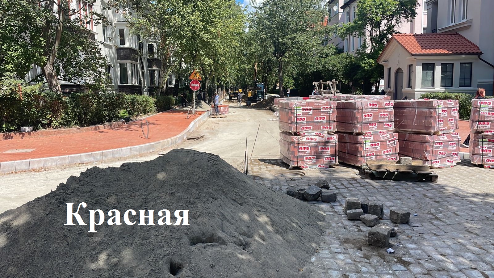По ул. Красной мостовики, продвигаясь от проспекта Мира к ул. Марш Борзова, укладывают камень и плитку, выставляют бортовые камни и готовят дорожное корыто, укладывают слои оснований на следующих участках.