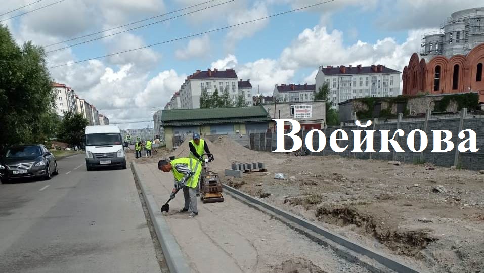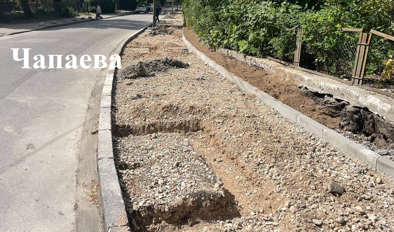 На тротуаре по проспекту Калинина устанавливают бортовой камень и готовят основание на перекрёстке с Октябрьской. Такие же работы плюс озеленение – на Дзержинского. На тротуарах по ул. Фёдора Воейкова, Чувашской, Камской и Чапаева идут аналогичные работы: устройство основания из песка и щебня, установка бортового камня.