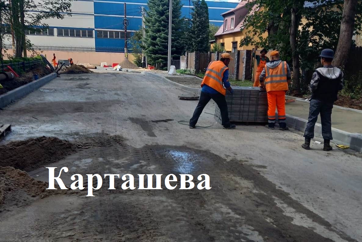 Реконструкция ул. Карташева: ставят бортовые камни и укладывают плитку на тротуарах ближе к перекрёстку с Магнитогорской.
