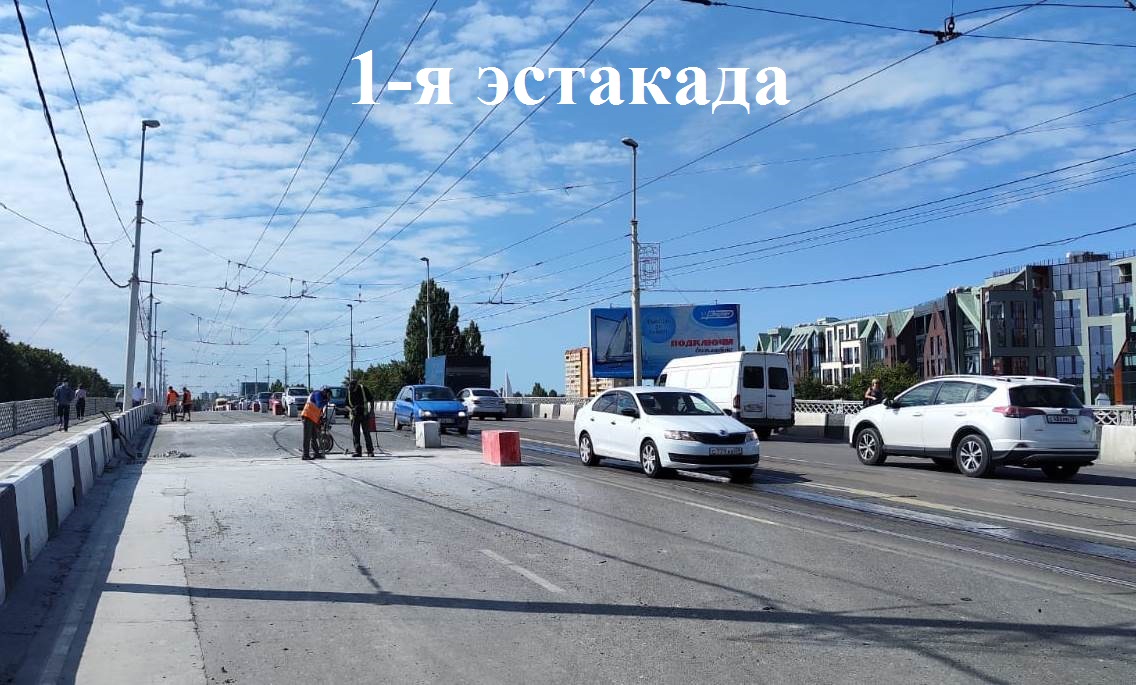 Первая эстакада: утром 11 августа на объекте прошло совещание с участием подрядчика, специалистов комитета развития дорожно-транспортной инфраструктуры и МКУ «Городское дорожное строительство и ремонт». Участники встречи констатировали – ремонт в запланированных объёмах идёт к завершению, остаётся в ночное время доизолировать швы и устранить ряд замечаний. Ориентировочная дата окончания работ – 16 августа.