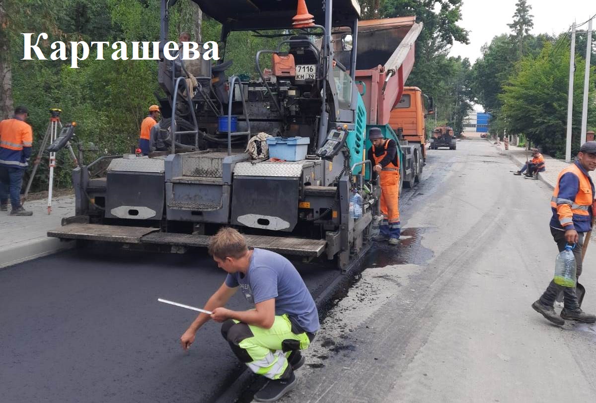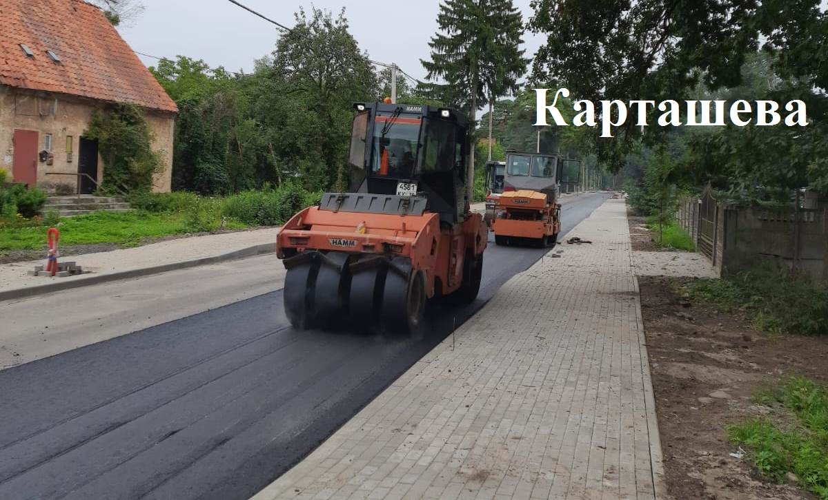 Реконструкция ул. Карташева: тротуарные работы завершают и укладывают второй слой асфальта на последних 300 метрах улицы. Предстоит ещё закатать и верхний, третий слой, дорожники выберут для этого максимально благоприятную погоду, чтобы выполнить укладку от Балтийского шоссе до Магнитогорской с минимальным количеством стыков.