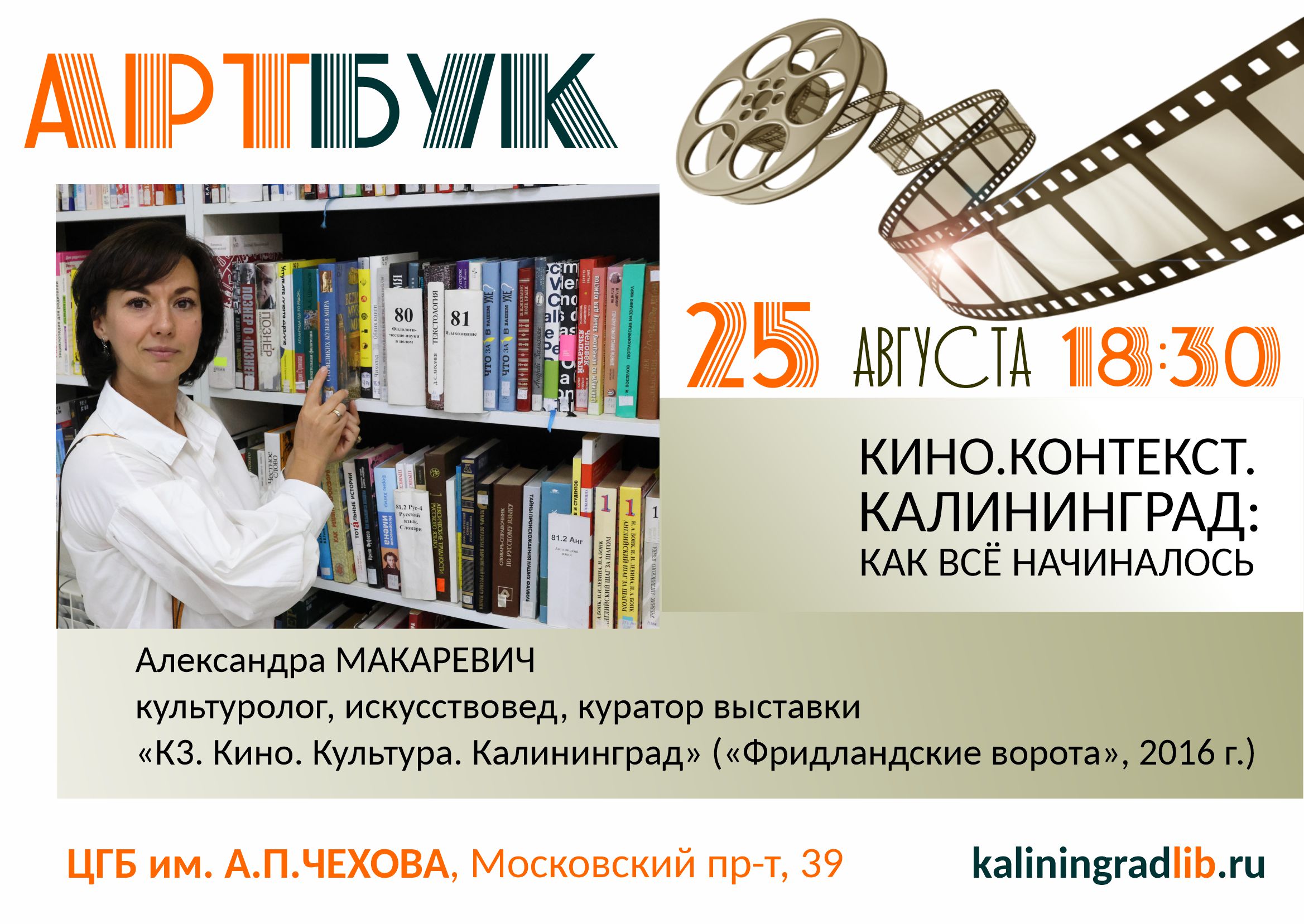 25 августа в 18.30 в «Чеховке» во время «Арт-Бук» вечеринки пройдёт лекция искусствоведа Александры Макаревич «Кино. Контекст. Калининград: как всё начиналось».