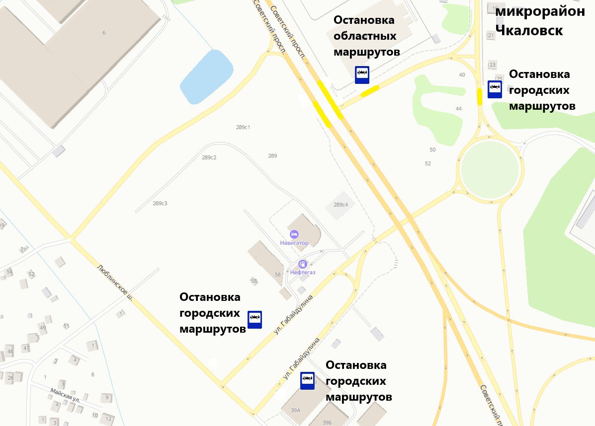 Маршруты № 31 «ул. Б. Окружная 4-ая – мкр. Чкаловск», № 36 «ул. О. Кошевого – мкр. Чкаловск», № 72 «завод «Янтарь» – мкр. Чкаловск» по направлению к конечному остановочному пункту «мкр. Чкаловск» поедут: по Советскому проспекту, ул. Габайдулина (через перекрёсток с круговым движением) и далее по существующим схемам движения. В обратном направлении: по ул. Габайдулина (через перекрёсток с круговым движением, тоннель), Люблинскому шоссе, Советскому проспекту и далее по существующим схемам движения.