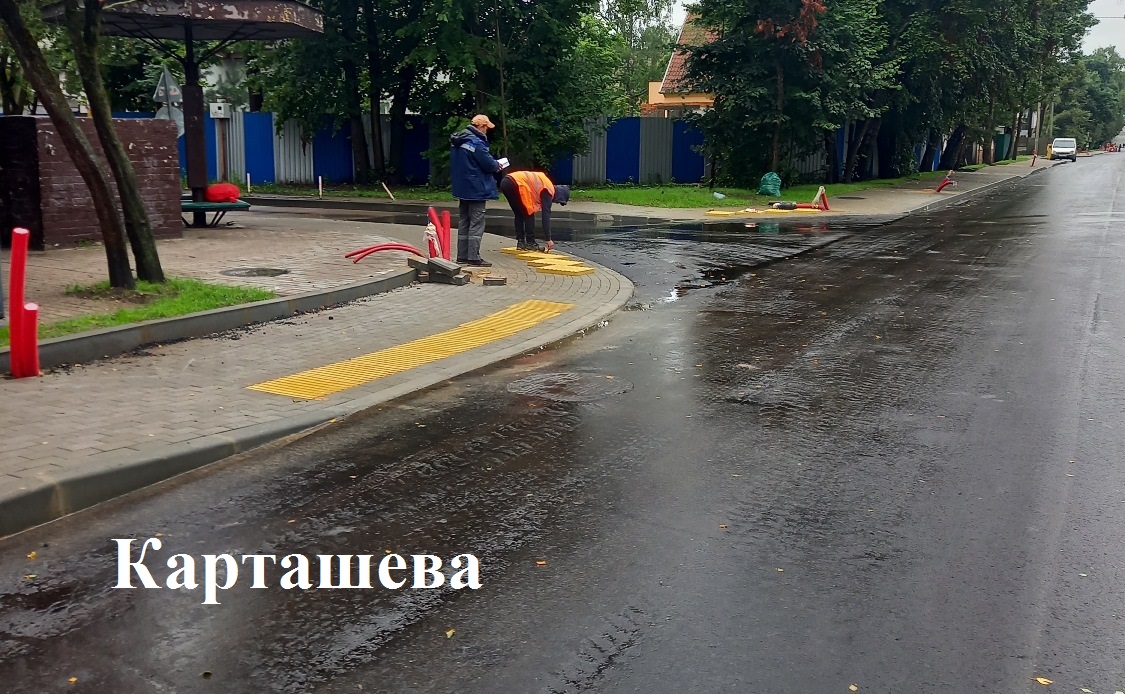 Реконструкция ул. Карташева: уложен верхний, третий, слой асфальтобетона от мемориала до Магнитогорской, дорожники докладывали плитку на тротуарах над местами прокладки сетей, ожидается поставка опор освещения, а также сетки для укладки асфальта от Балтийского шоссе до памятника.