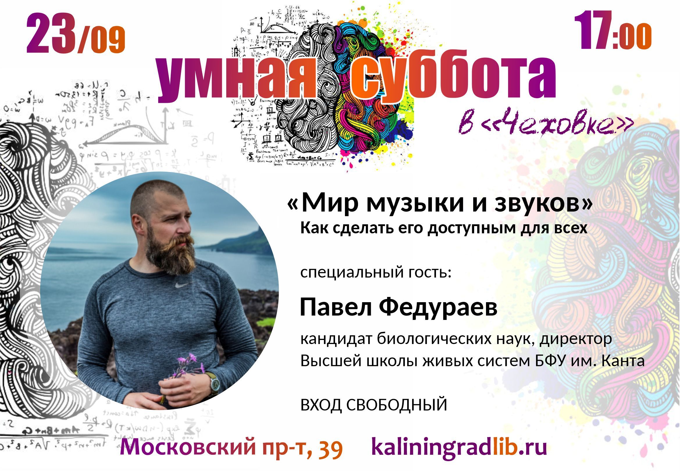 23 сентября в рамках интеллектуального дня «Умной субботы» выступит специальный гость мероприятия — кандидат биологических наук, директор Высшей школы живых систем БФУ им. Канта Павел Федураев. Тема лекции: «Мир музыки и звуков. Как сделать его доступным для всех».