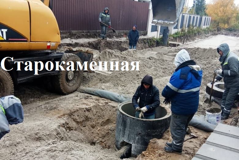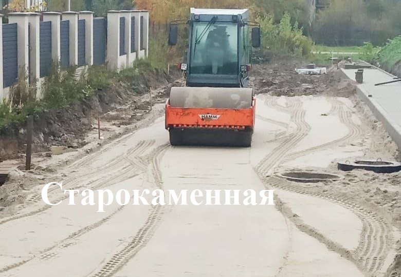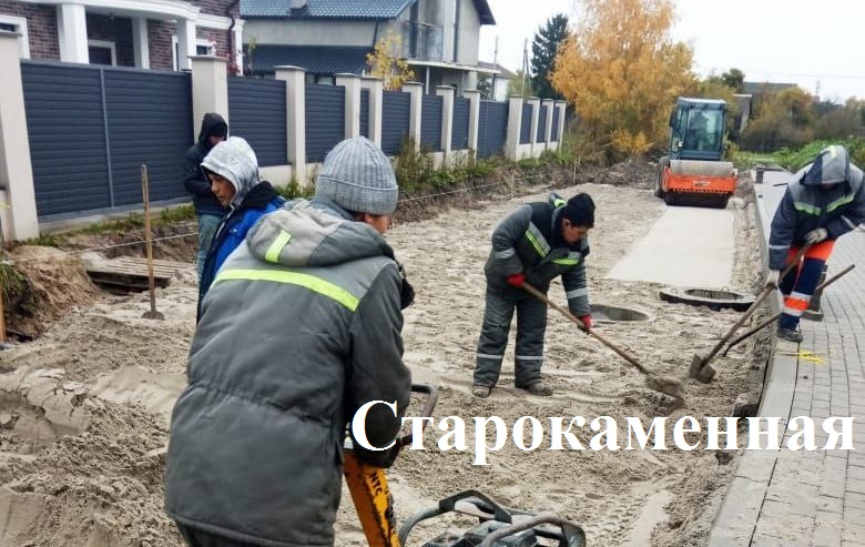 На капремонте ул. Старокаменной прокладывают канализационные трубы и монтируют колодцы, устраивают песчаное основание проезжей части. На разворотной площадке и парковке по ул. Согласия у ДС «Янтарный» - укладывают плитку.