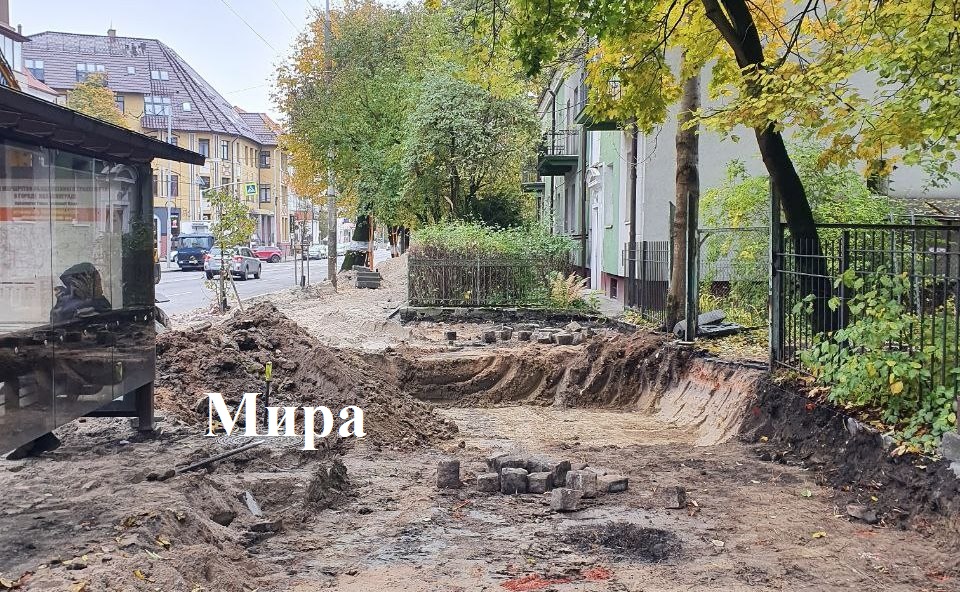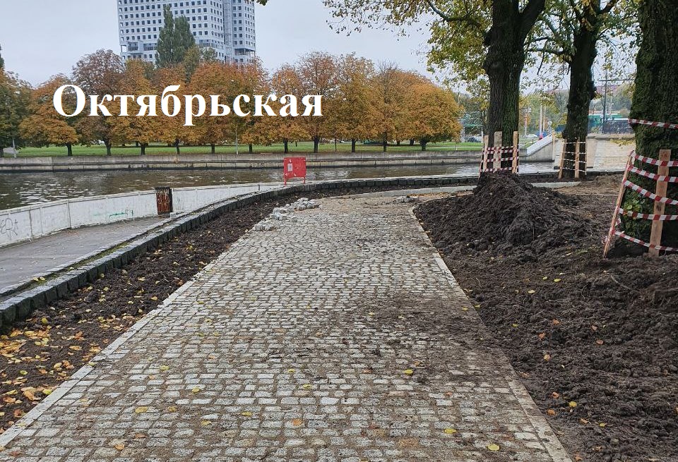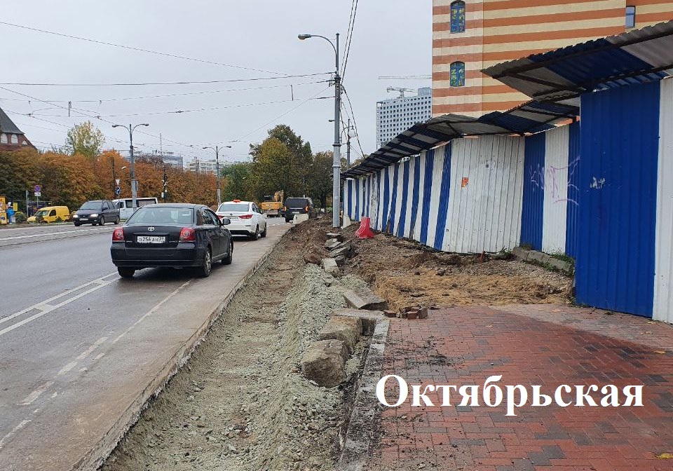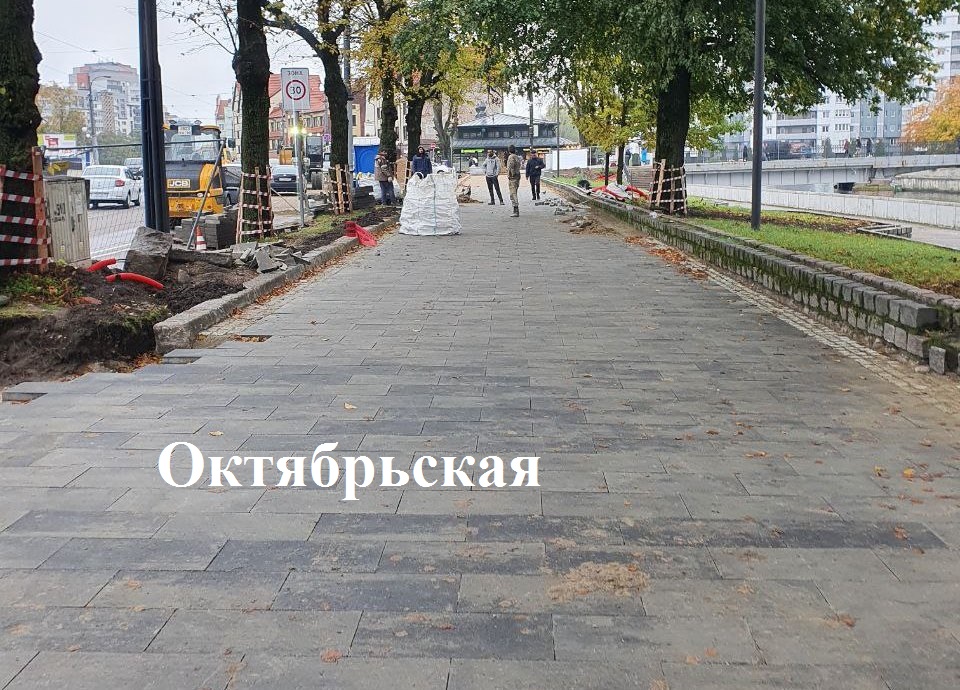 На ул. Октябрьской напротив Кафедрального собора продолжают устройство основания тротуара и парковки, установку борта, укладку плитки и брусчатки вместо изношенного асфальта.