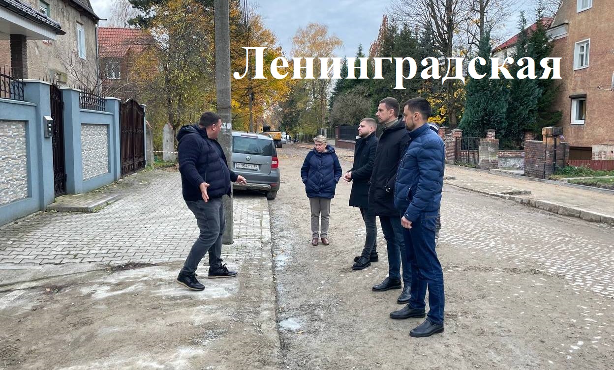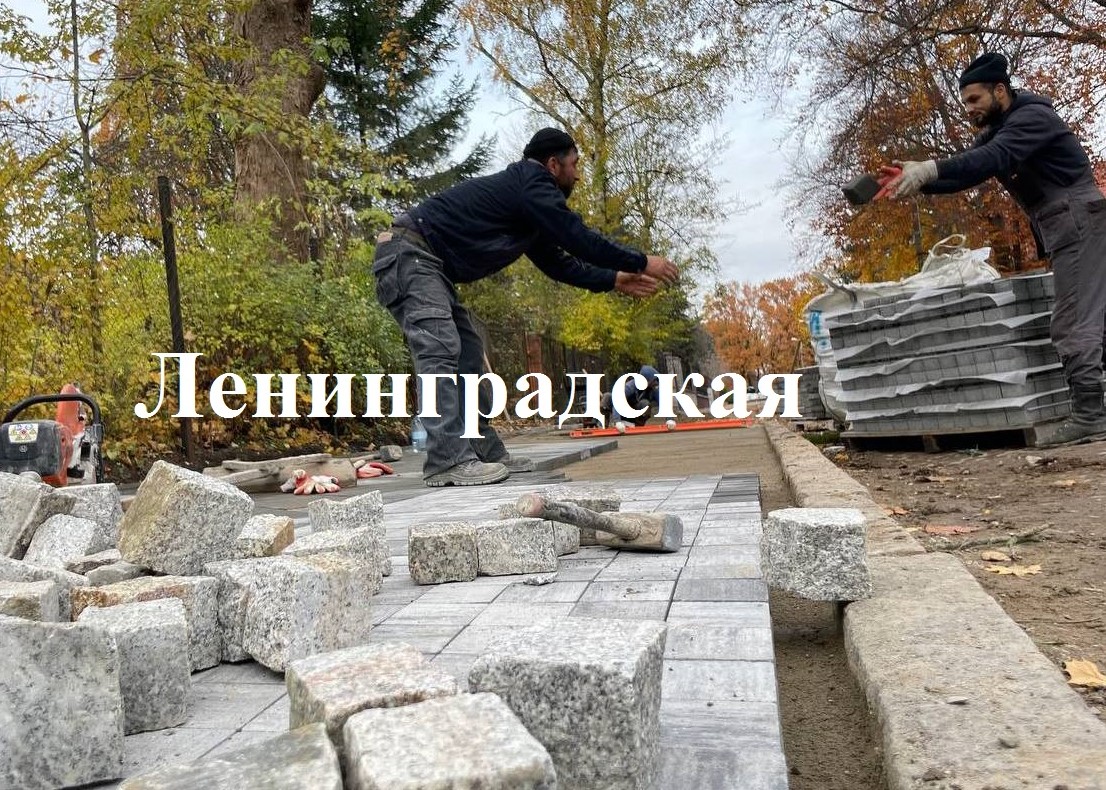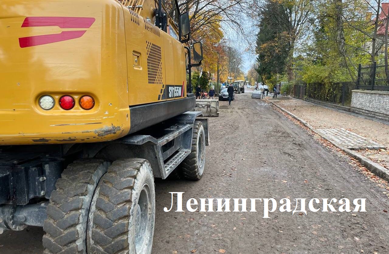 На ул. Ленинградской дорожники продолжали регулировать бортовой гранитный камень и устраивать песчаное и щебёночное основание под мощение тротуаров.