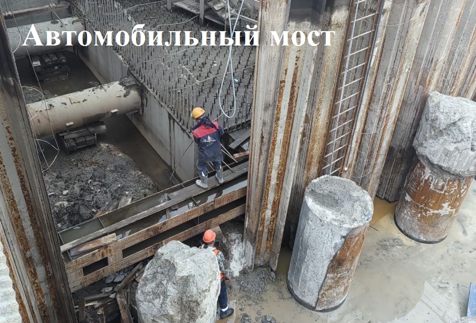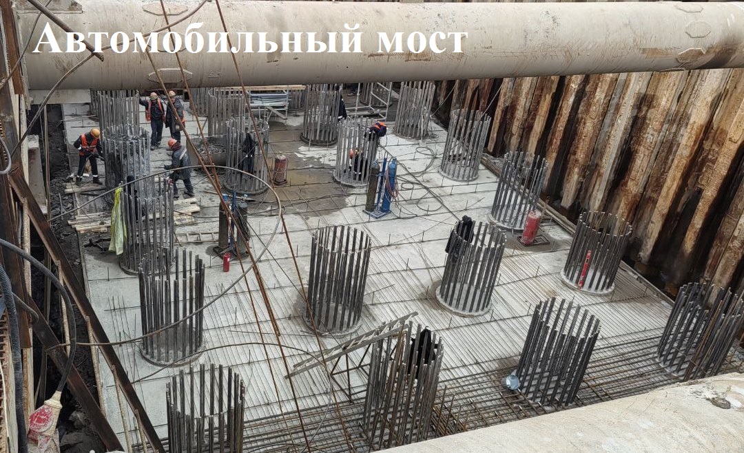 На будущем автомобильном мосту продолжают плановые работы на опорах № 4 и № 5, усиление грунтов, бурение и бетонирование свай, сборку стапеля и пролётного строения, устройство временных опор, погружение свай для дождевой канализации, возведение подпорной стенки.