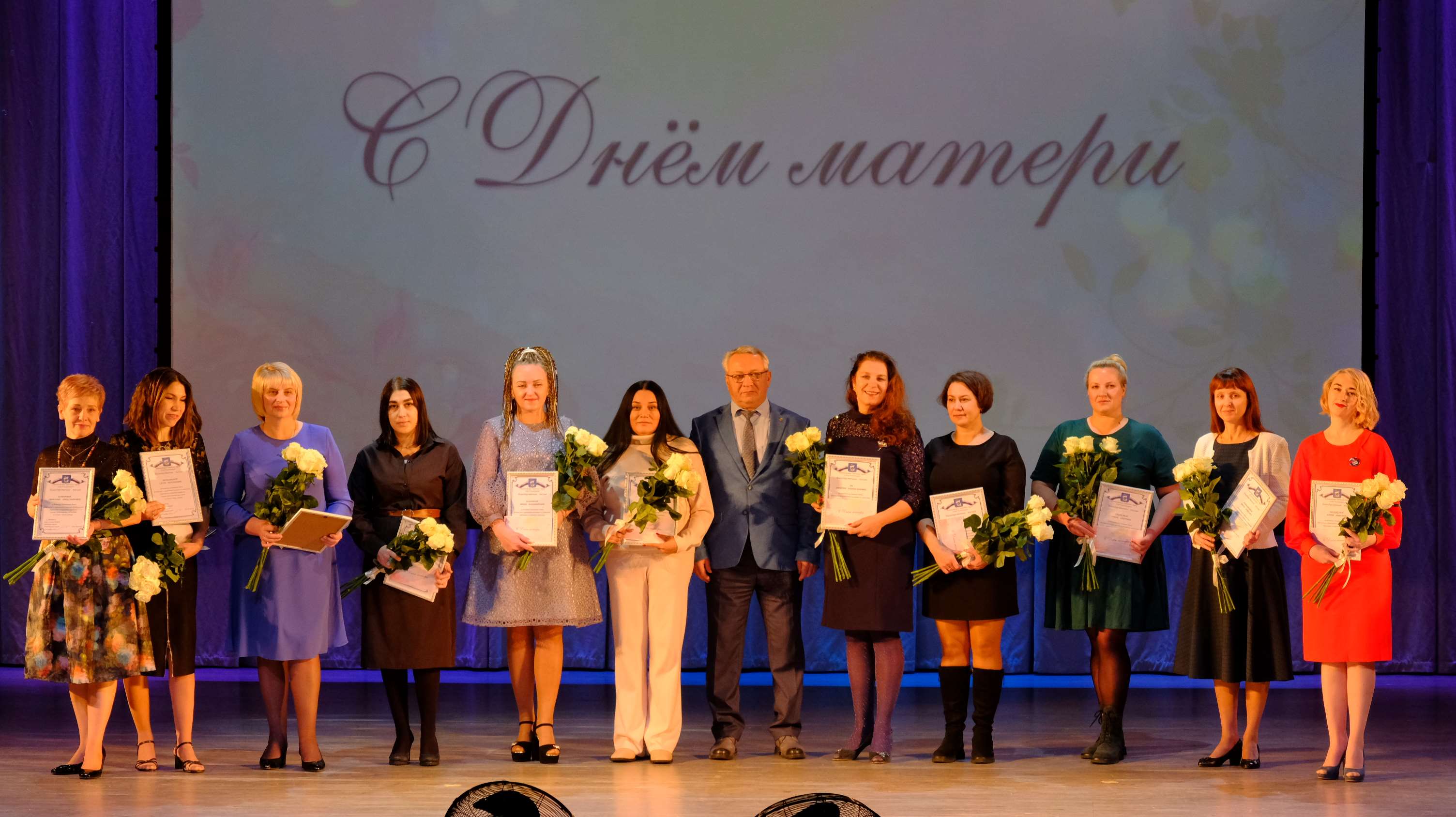 Одиннадцать матерей чествовали на сцене в этот день. Олег Аминов вручил благодарственные письма, подарки и цветы. В числе награждённых матери и жёны участников специальной военной операции, ветеранов боевых действий, а также матери – активистки добровольческого движения, педагоги и наставники, достойно воспитывающие или воспитавшие своих детей, формирующие у молодёжи высокие нравственные качества, патриотизм и гражданственность.
