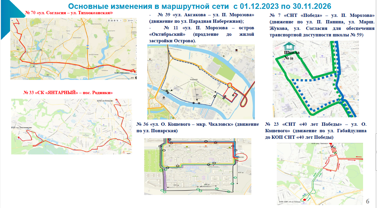 - №7 «СНТ «Победа» – ул. П. Морозова» (движение по ул. П. Панина, ул. Марш. Жукова, ул. Согласия для обеспечения транспортной доступности школы №59);