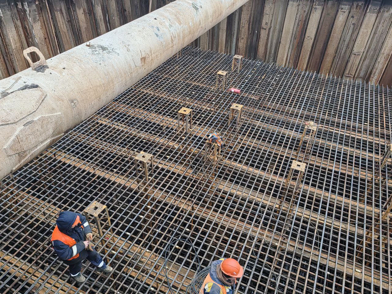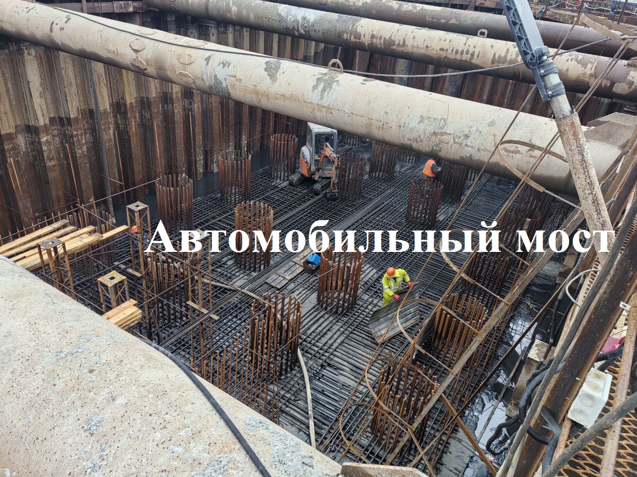 На строительстве автомобильного моста специалисты бурят сваи и бетонируют подпорную стенку, армируют ростверк опоры №4, монтируют на временные опоры пролётные строения на левом и на правом берегах Преголи.