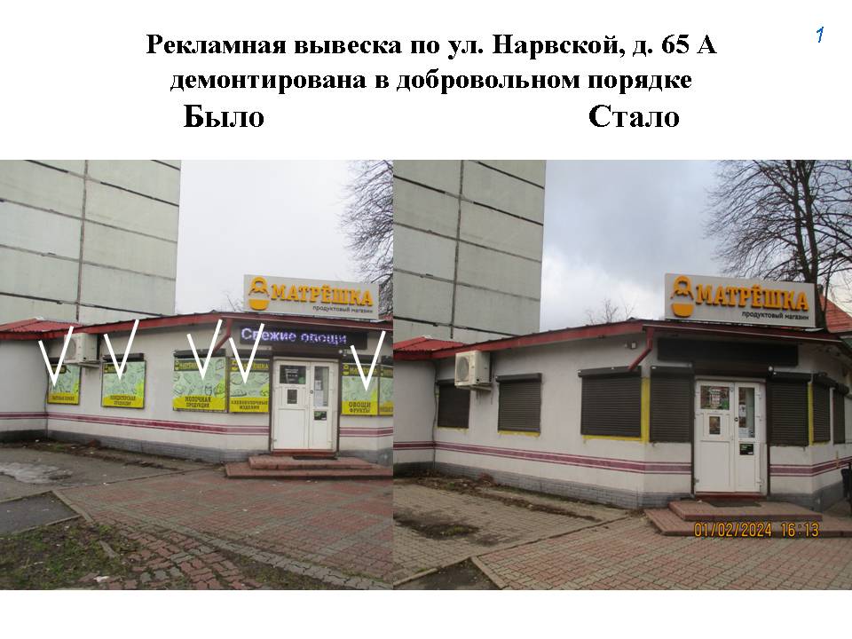 Рекламные вывески демонтировали по адресу ул. Нарвская д.65а. Отсюда же убрали электронное табло.