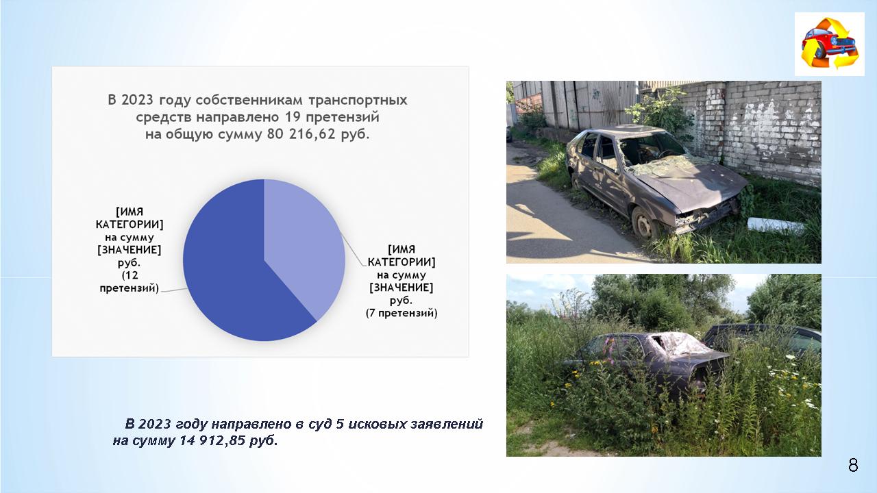 В прошлом году на специализированный пункт временного хранения было перемещено 64 авто. Средства, затраченные на транспортировку забытых собственниками машин, возвращаются в бюджет. Собственникам транспортных средств выставлено 19 претензий на сумму более восьмидесяти тысяч рублей. В суд направлено 5 исковых заявлений на сумму 14 912,85 руб.