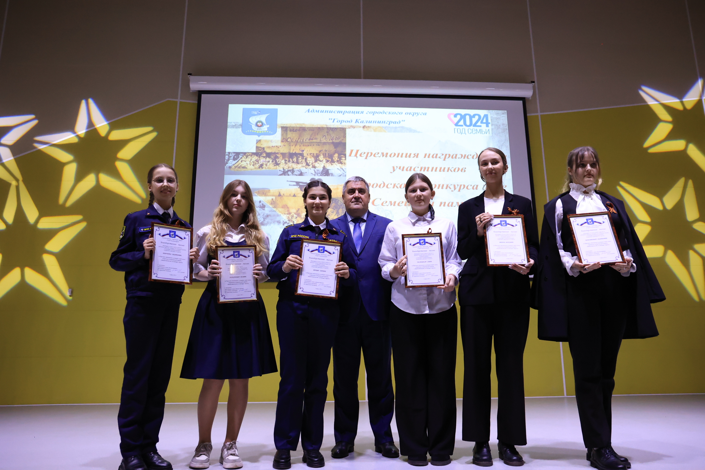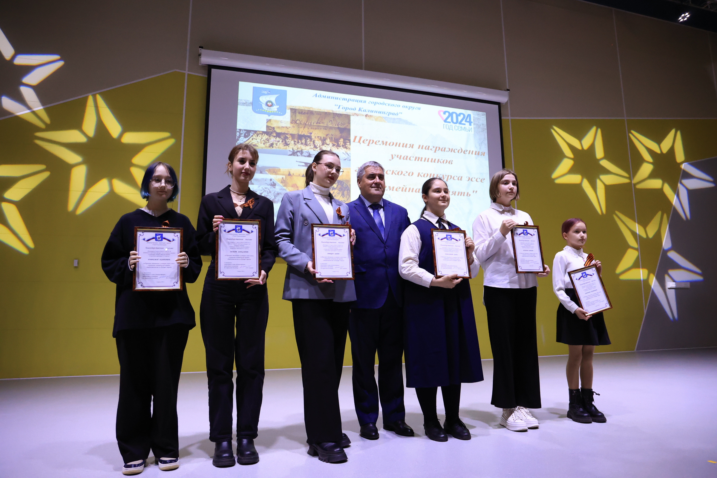 Торжественная церемония награждения победителей городского конкурса эссе «Семейная память», посвященного 79-й годовщине Штурма Кенигсберга прошла в четырех номинациях: «Военная история моей семьи»; «Подвиг твой бессмертен»; «История наград»; «Семейная реликвия». Благодарственные письма комитета по социальной политике администрации городского округа «Город Калининград» получили учащиеся, ставшие призерами и победителями городского конкурса эссе «Семейная память» за бережное отношение к истории своей семьи, сохранение исторической правды, ответственности за будущее страны - Кацер Эрик, 8 «ФЛ» класса лицея № 23; Лопатина Марьяна, 6 «М» класс школы № 56; Игнатов Кирилл, 6 «В» класс ГБОУ КО КШИ «АПКМК»; Асонкова Мария, 7 класс МАОУ лицей № 23; Аверьянова Варвара, 7 «Л» класс школы № 10; Вьюгин Леонид, 10 класс Филиала НФМУ в г. Калининграде; Карпенко Елизавета, 10 «А» класс лицея «Ганзейская ладья»; Гончаров Андрей, 9 «В» класс школы № 21 им. А.А. Леонова; Буякова Варвара, 7 «Г» класс школы № 8; Амирова Екатерина, 6 «М» класс школы № 56; Дзасохова Ольга, 7 «В» класс школы № 31; Прищеп Алина, 11 «А» класс школы № 13; Лымарь Александра, 11 «А» класс школы № 13; Новикова Екатерина, 9 «А» класс школы № 10; Бороздин Марк, 6 «В» класс школы № 15; Петухова Дарья, 9 «ФМ» класс лицея № 23; Чесневская Элина, 8 «Б» класс школы № 13; Вердян Нарине, 6 «Б» класс школы № 2; Лоскутова Полина, 7 «Р» класса; Демченко Екатерина, 6 «П» класс школы № 2; Видюк Ангелина,10 класс школы № 29; Шендерюк-Жидкова Агния, 9 класс лицея № 23; Мамонтова Екатерина, 10 «Б» класс лицея № 17.