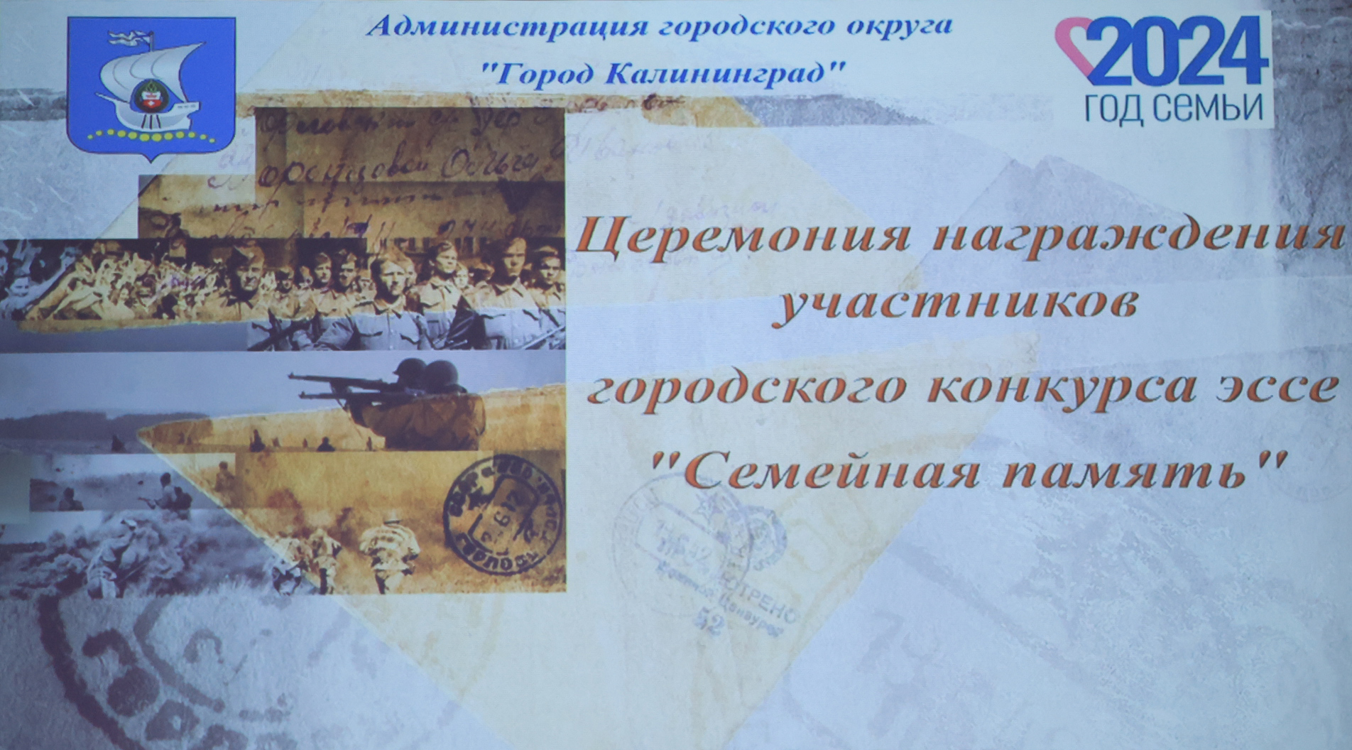 В год семьи администрацией городского округа «Город Калининград» организован городской конкурс эссе «Семейная память». Конкурс объединил более 100 юных патриотов и членов их семей из всех образовательных организаций, находящихся на территории Калининграда и показал востребованность этой темы. Все представленные на конкурс работы наполнены чувством гордости, глубокого осмысления наследия Победы, покоряют искренностью и желанием поделиться историей своего героя. Конкурсанты не просто интересуются военной историей своей семьи, а глубоко знают её, знают военные дороги своих прапрадедов, их подвиги, фронтовые удачи и потери, знают историю их наград. Именно истории семьи стали мощным объединяющим началом нескольких поколений калининградцев.