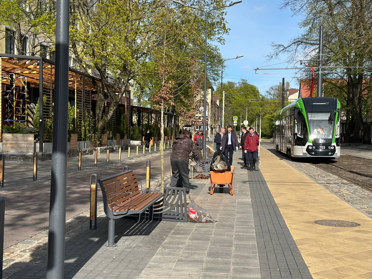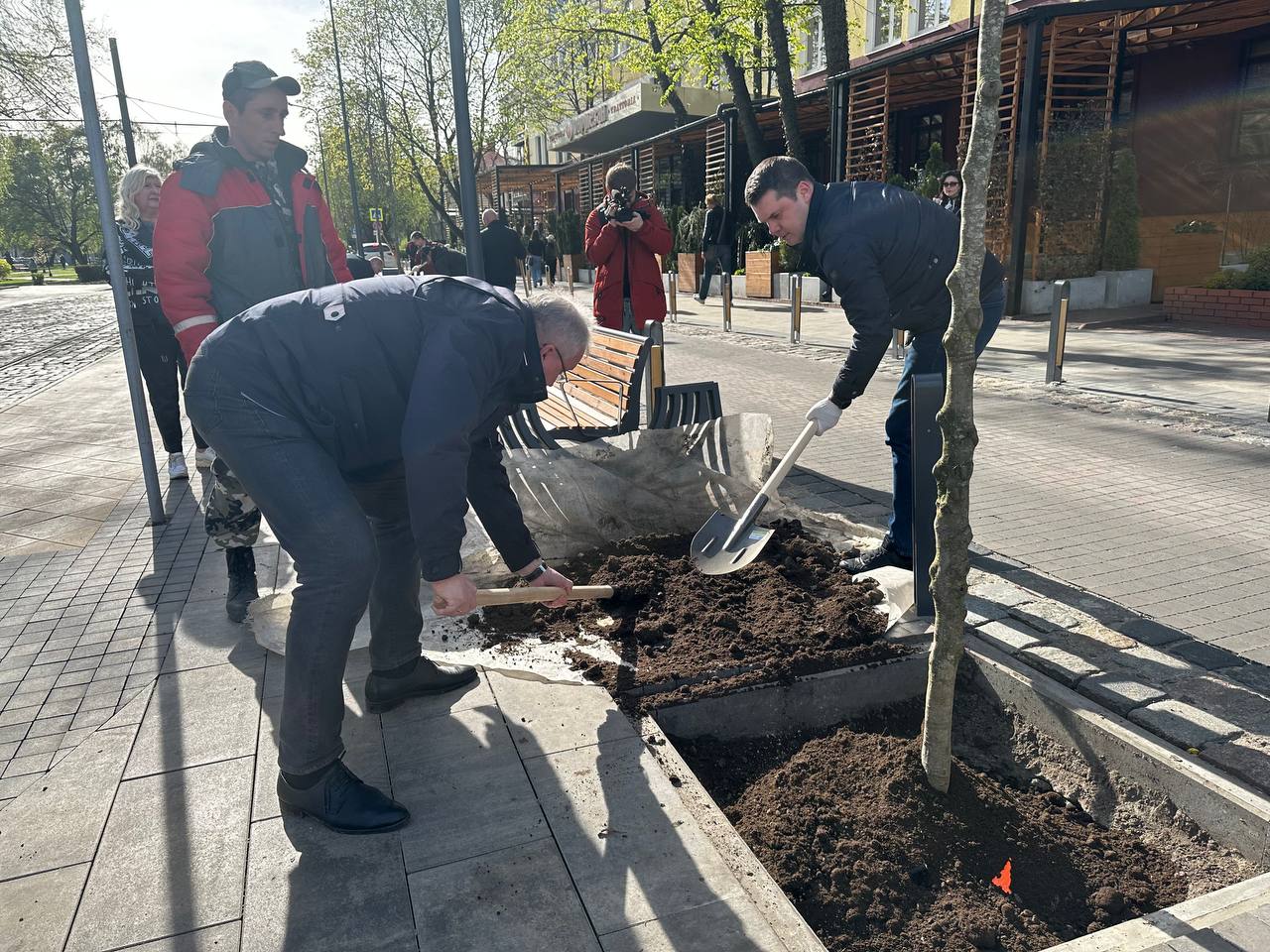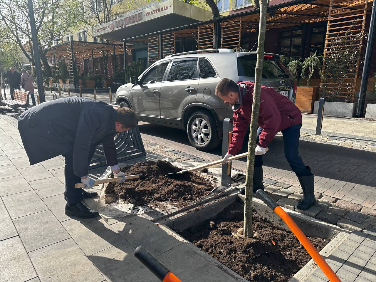Это уже вполне взрослые 4-х метровые 14-летние деревья. Перед посадкой заранее подготовили приствольные решётки, оформленные в рамках капитального ремонта дороги. Руководители профильных комитетов городской администрации не только проконтролировали процесс, но и сами приняли активное участие в озеленении.