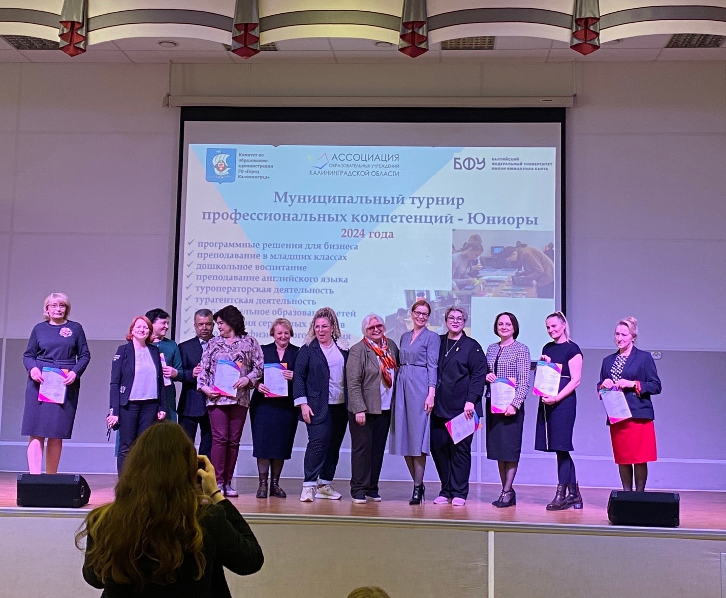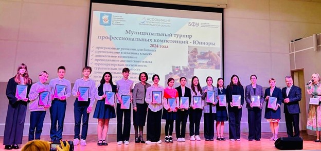 В рамках Конгресса 18 апреля состоялось награждение победителей III муниципального турнира профессиональных компетенций Юниоры, который проходил с 10 по 18 апреля на базе 8 образовательных учреждений Калининграда – гимназий №№ 22, 32, 40, школ №№ 25, 43, 56, 57 и детского сада № 135. Участники турнира – это обучающиеся общеобразовательных учреждений города в возрасте до 16 лет, которые принимали участие в 9 соревновательных компетенциях: «Преподавание в младших классах», «Туроператорская деятельность», «Турагентская деятельность», «Дошкольное воспитание», «Дополнительное образование детей», «Преподавание английского языка в ДФ», «Эксплуатация сервисных роботов», «Технологии физического развития» и «Программные решения для бизнеса». В церемонии награждения приняли участие доктор пед. наук, профессор ОНК «Институт образования и гуманитарных наук» БФУ им. И. Канта Конюшенко С.М., директор школы № 56 Коломиец А.В. и председатель комитета по образованию администрации городского округа «Город Калининград» Петухова Т.М.