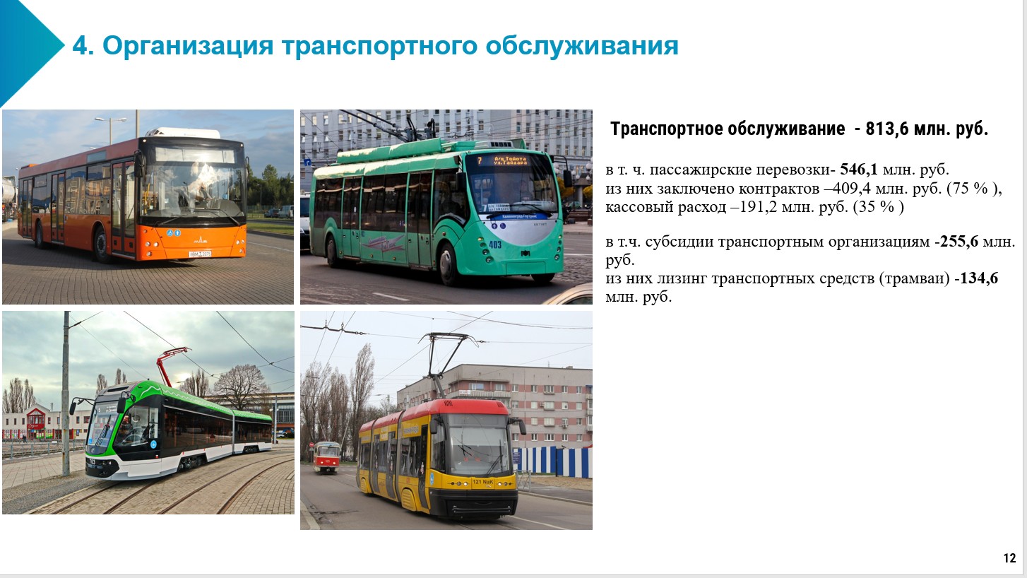 Последнее мероприятие программы – это организация транспортного обслуживания населения в границах городского округа. На реализацию данного мероприятия предусмотрено 813,6 млн.руб., финансируются муниципальные контракты на работы, связанные с осуществлением регулярных перевозок пассажиров и багажа автомобильным и электрическим транспортом (546,1 млн. руб.), предоставляется субсидия на возмещение недополученных доходов в связи с перевозкой льготных категорий граждан (121,0 млн. руб.), субсидия на оплату части лизинговых платежей по договорам финансовой аренды (лизинга) трамваев (134,6 млн. руб.).