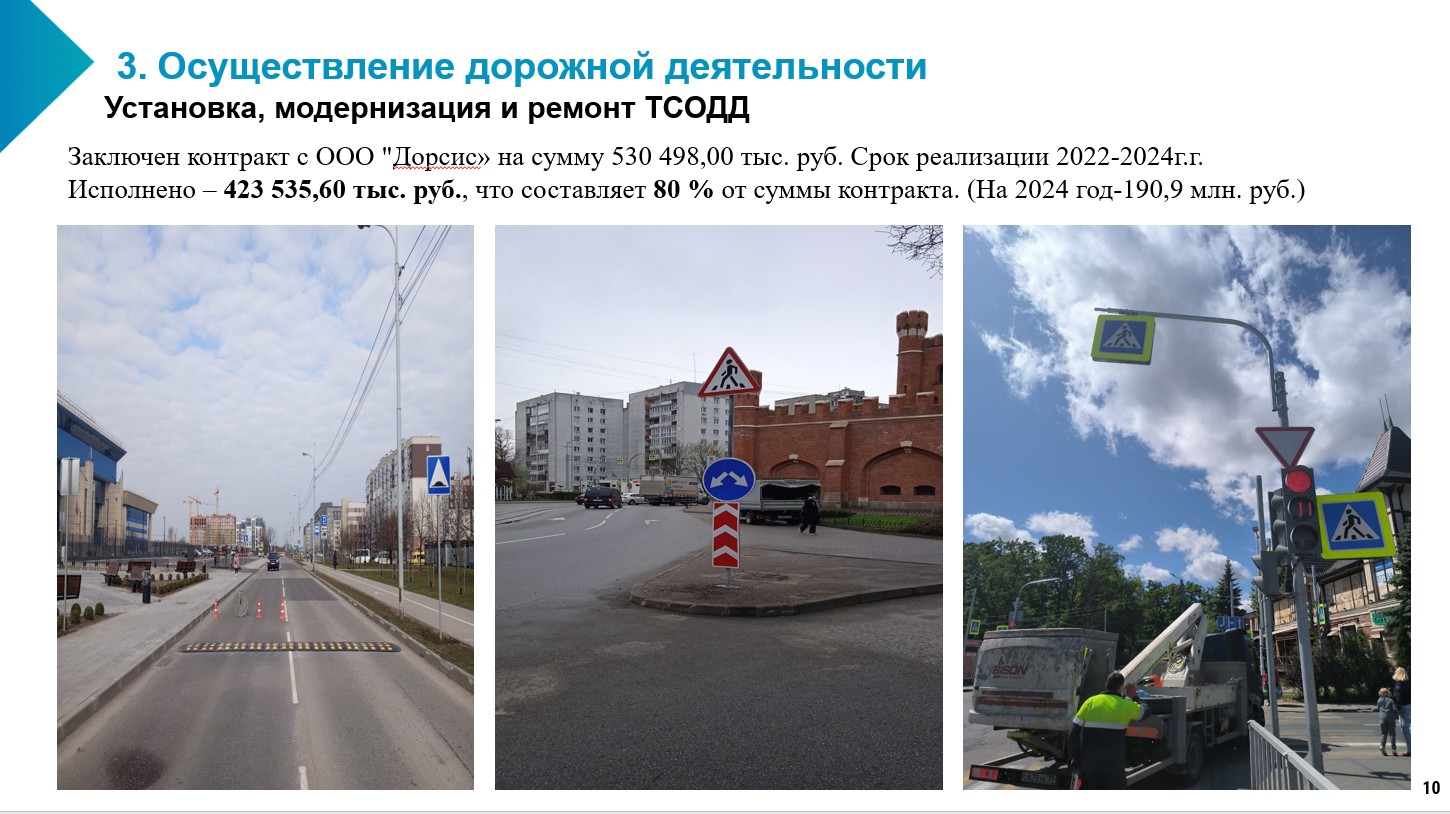 Продолжаются работы по установке, модернизации и ремонту технических средств организации дорожного движения (ТСОДД), в том числе на 2024 год предусмотрено - 190,9 млн. руб.