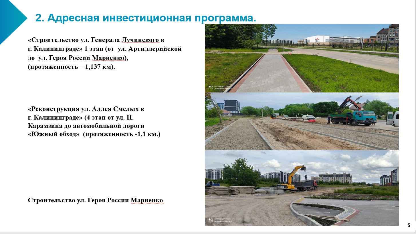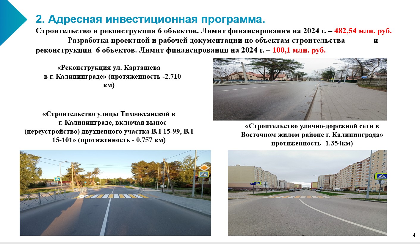 Реализация основных направлений инвестиционной политики в области развития автомобильных дорог местного значения городского округа «Город Калининград» - 582,6 млн. рублей - включает в себя капитальные вложения в рамках дорожной деятельности. На реализацию адресной инвестиционной программы предусмотрено 582,6 млн. руб., в том числе: строительно-монтажные работы – 482,54 млн. руб., проектно-сметная документация – 100,1 млн. руб. Заключено контрактов на сумму 413,9 млн. руб. (71%), кассовый расход – 50,2 млн. руб. (12 %).