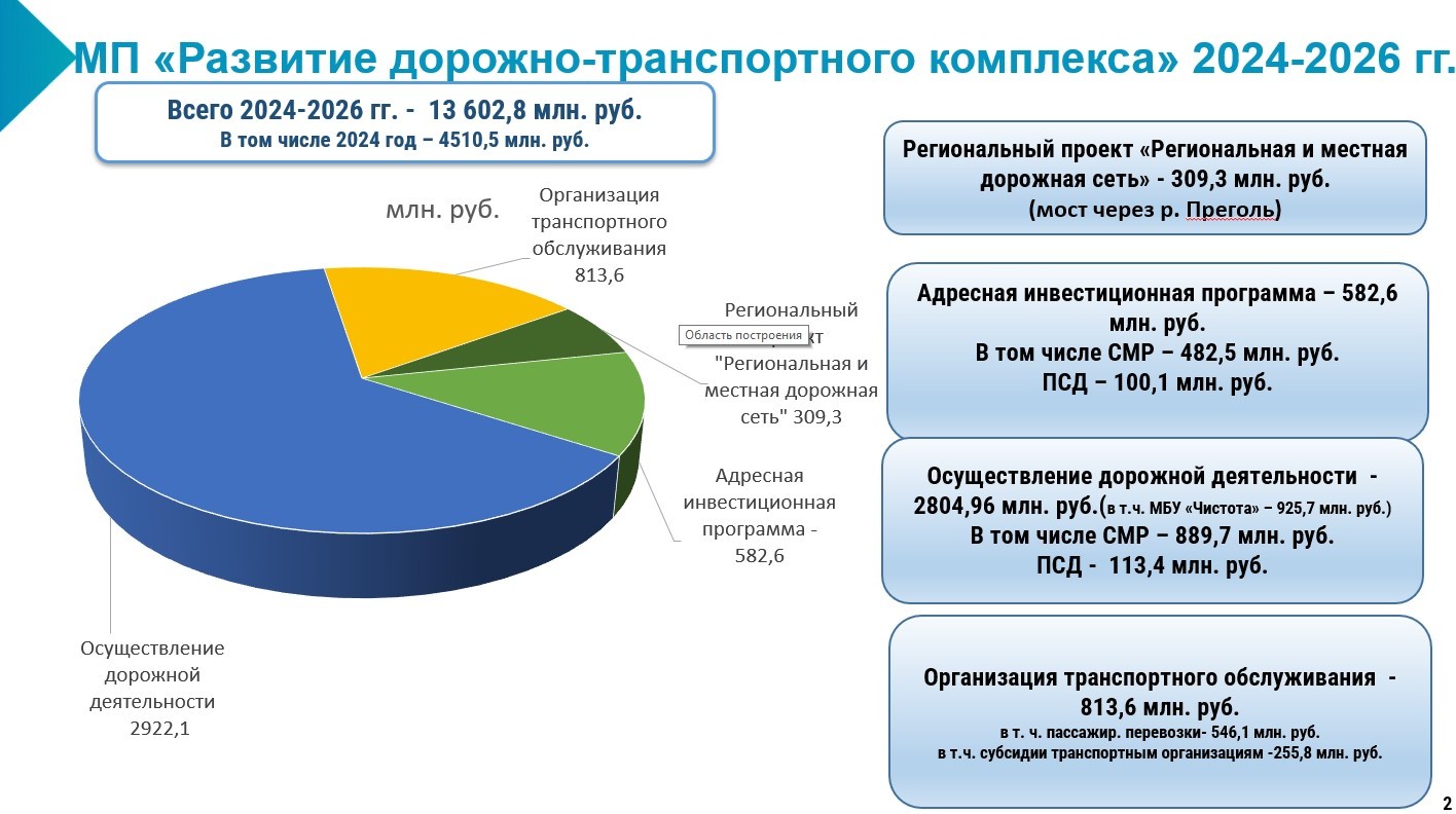 Региональный проект «Региональная и местная дорожная сеть» - 309,3 млн. рублей. В рамках этого мероприятия реализуется объект «Реконструкция разводного моста через реку Преголя на участке Калининград-Советск Калининградской железной дороги». Годы реализации объекта 2021-2025 гг., протяженность объекта – 2,22 км, готовность объекта 29,0%.