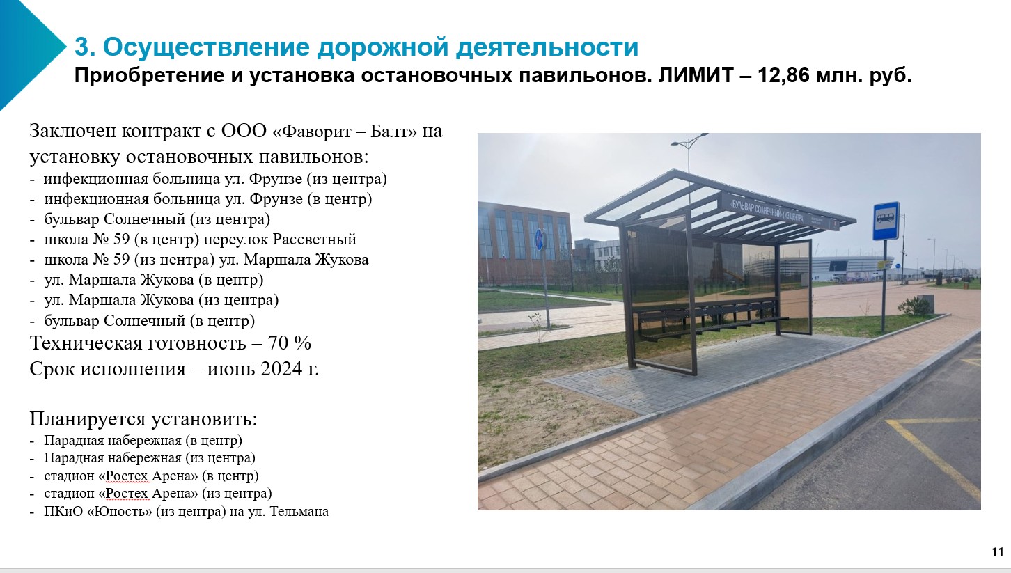 На приобретение и установку остановочных павильонов предусмотрено 12,86 млн. руб. Заключен муниципальный контракт на установку 8 павильонов со сроком исполнения – июнь 2024 г. Техническая готовность 70 %.