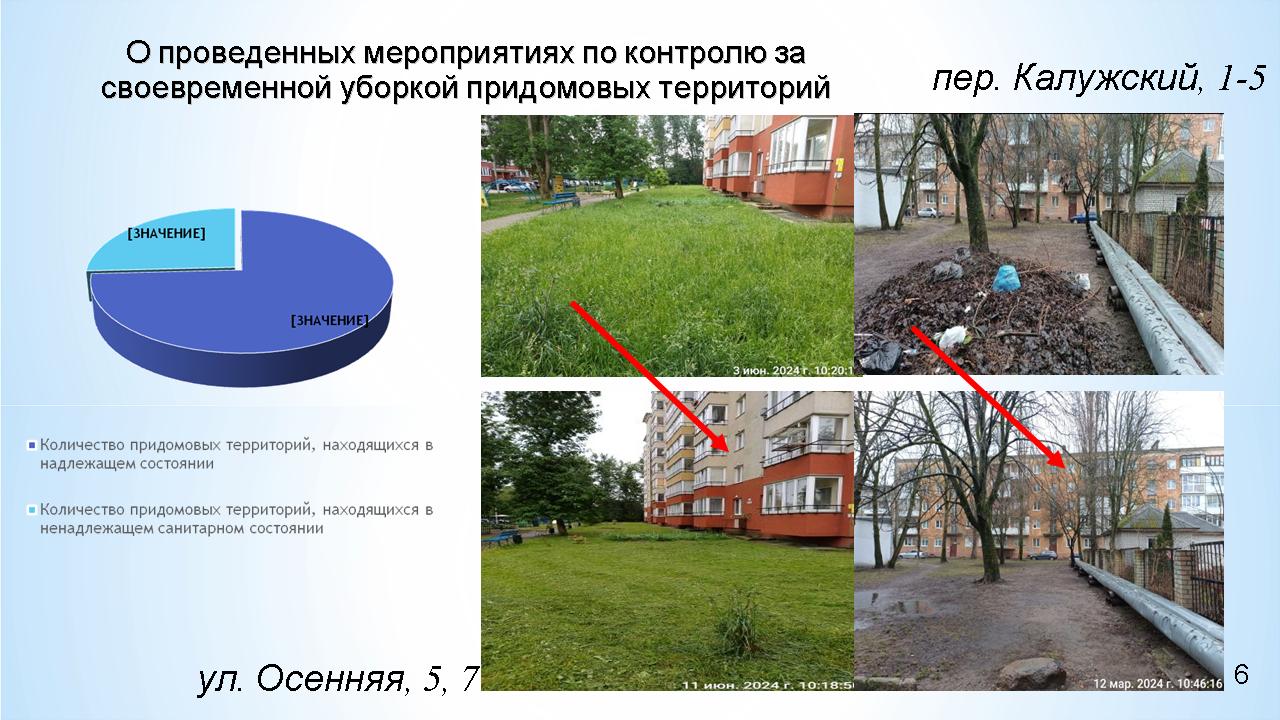 Усилен контроль за своевременной уборкой придомовых территорий. Сотрудниками комитета проведено 1 962 мероприятия. В итоге - 1 455 придомовых территорий находились в удовлетворительном состоянии; 507 - в неудовлетворительном состоянии: зафиксированы разброс мелкого мусора, порубочных остатков, мешков с мусором, крупногабаритного мусора, отсутствие покоса травы (до управляющих компаний доводилась соответствующая информация, меры по устранению принимались оперативно).