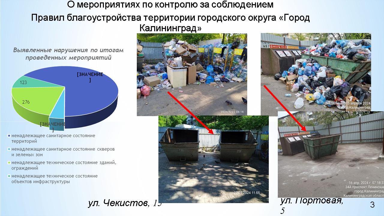 В период с 09.03. 2024 по 11.06.2024 проведено 4 064 мероприятия по контролю за соблюдением Правил благоустройства территории городского округа «Город Калининград». Из них 1 577 мероприятий по контролю за санитарным состоянием контейнерных площадок; 184 - по контролю за санитарным состоянием скверов и зеленых зон; 1 934 - по контролю за санитарным состоянием территорий.