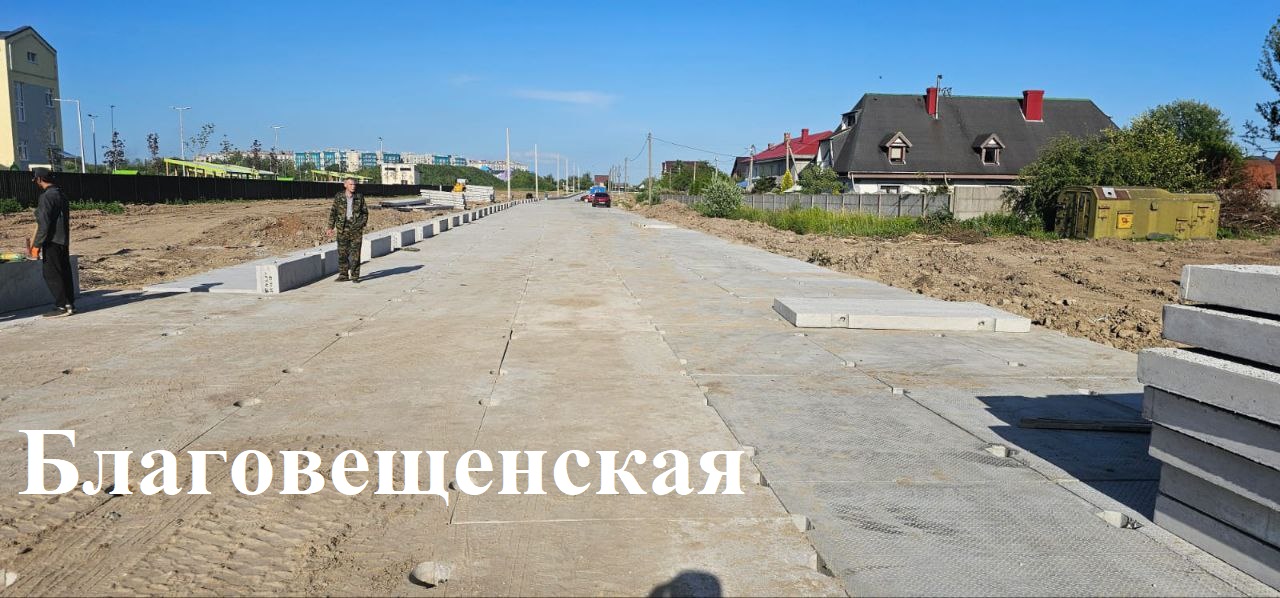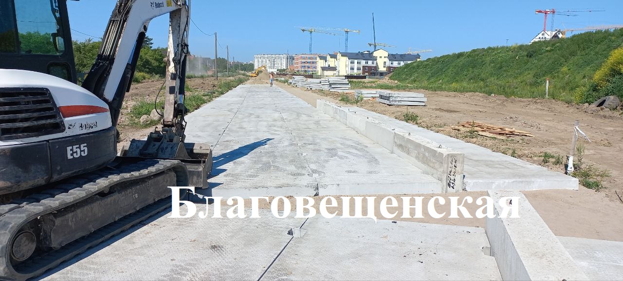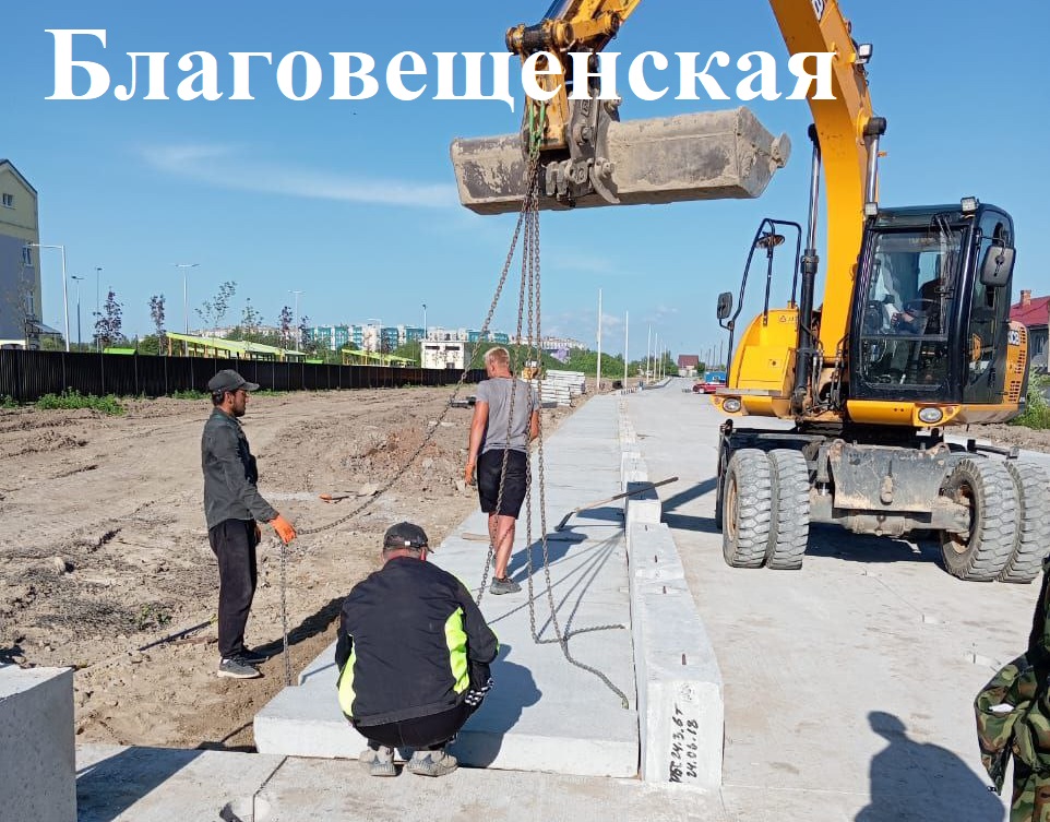 На строительстве участка ул. Благовещенской к детскому саду установили почти половину опор освещения, ведут монтаж блоков по тротуару, продолжают отсыпать основание, монтировать железобетонные плиты.