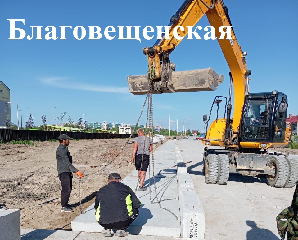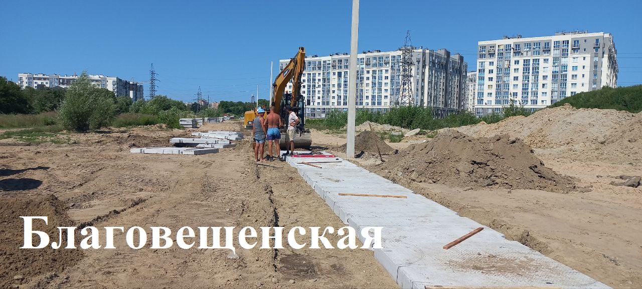 На строительстве участка ул. Благовещенской дорожники смонтировали 50 плит; завезли на объект очередные 86 плит, ведут устройство основания под тротуар. В субботу на объекте планируют протягивать СИП-кабели к светильникам наружного освещения.