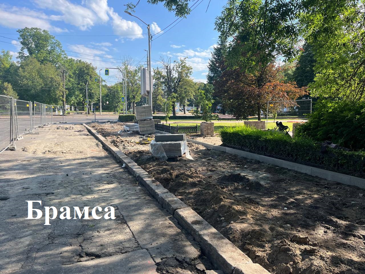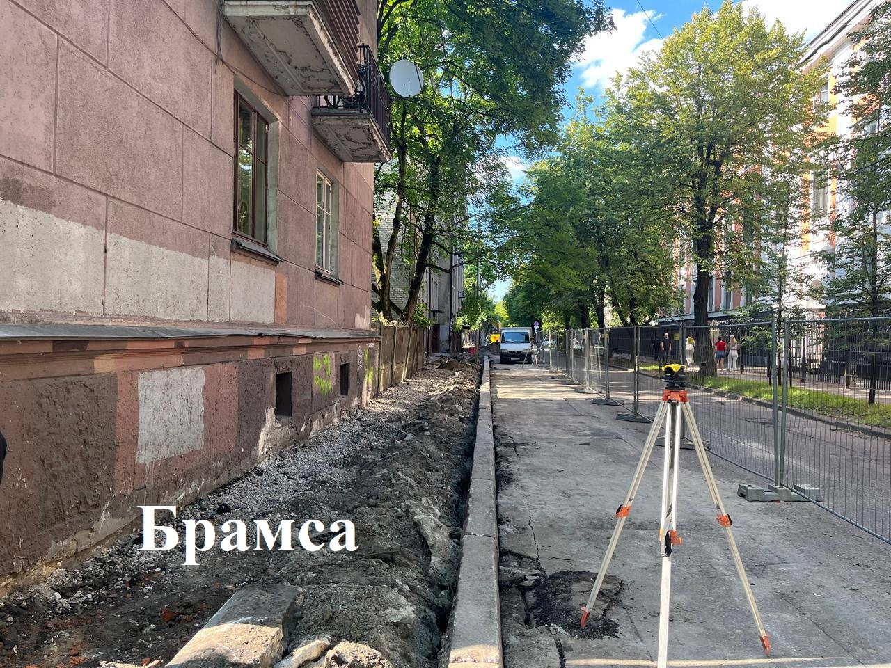 На ул. Брамса начали установку поребрика, демонтаж бортового камня, подготовку щебёночного основания. На Пехотной разбирают плитку и устанавливают борт.